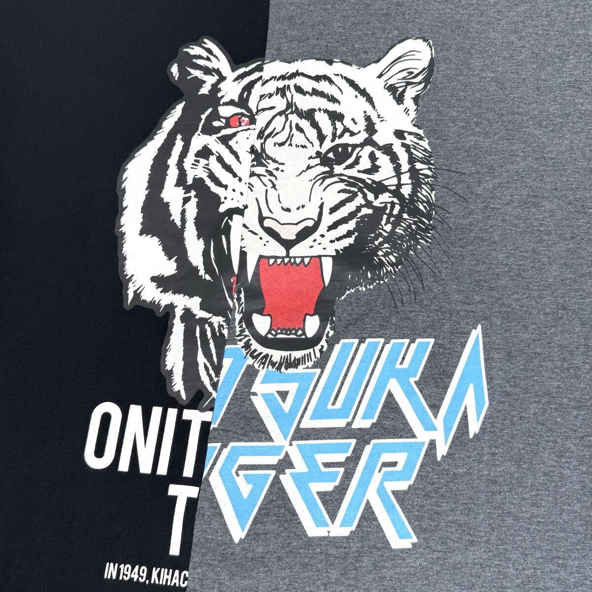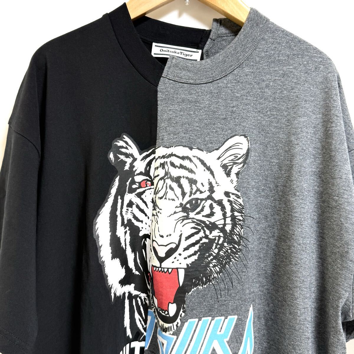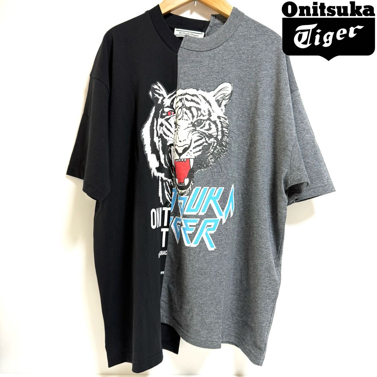 2つのTシャツを左右アシンメトリーにドッキングさせたデザインが特徴。左右に異なる虎のグラフィックがプリントされ、一体感のある仕上がりに。