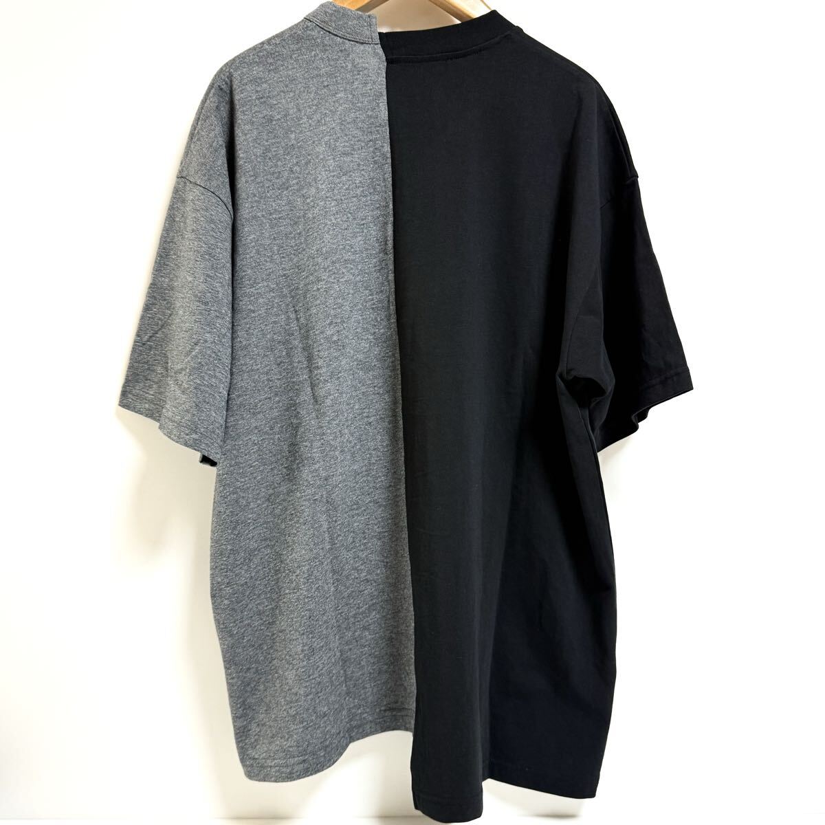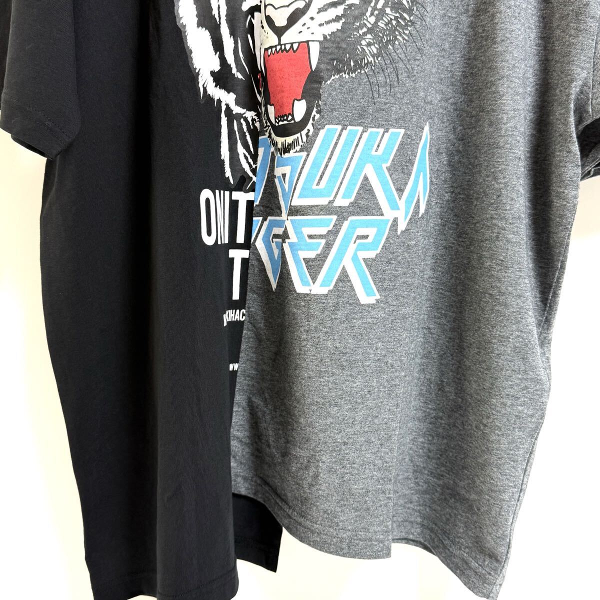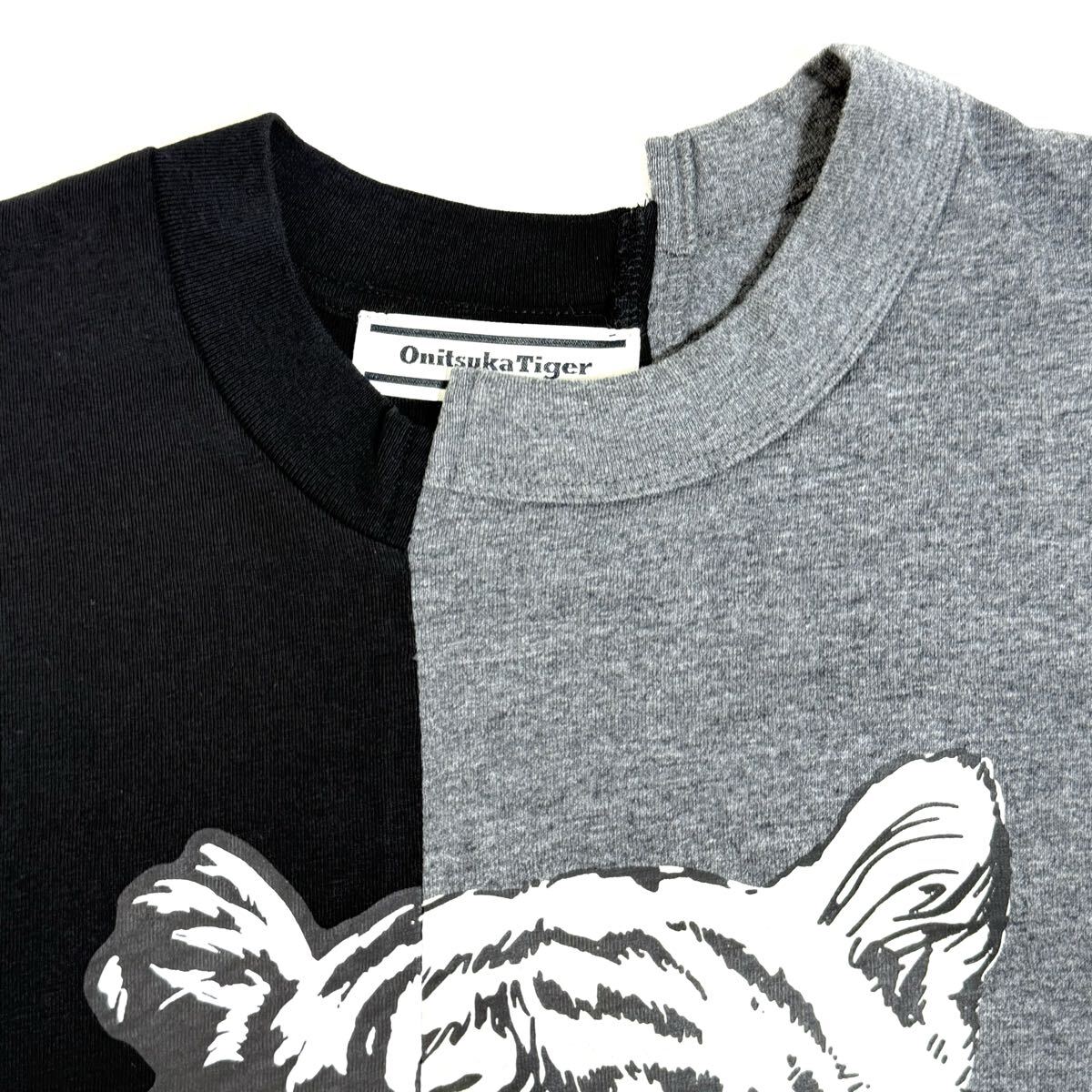 2つのTシャツを左右アシンメトリーにドッキングさせたデザインが特徴。左右に異なる虎のグラフィックがプリントされ、一体感のある仕上がりに。