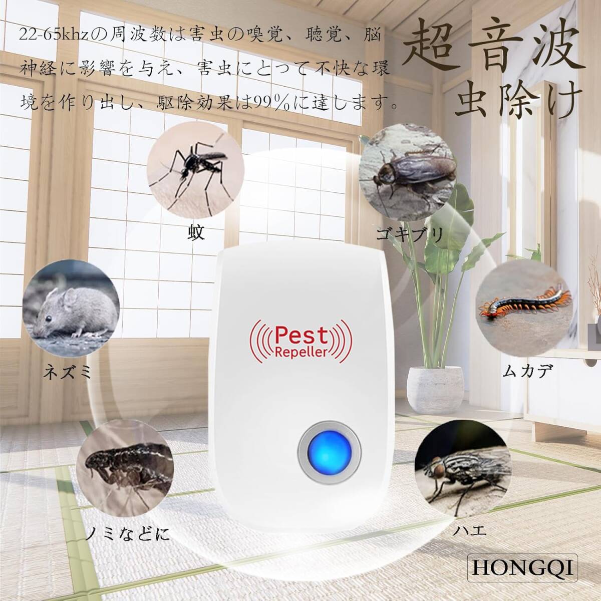 【強力な超音波】HONGQI超音波害虫駆除器は改良された音響共鳴技術を採用し、高周波超音波振動により低周波パルス音波を生成し、害虫の感覚系を破壊し、22-65khzの周波数は害虫の嗅覚、聴覚、脳神経に影響を与え、害虫にとって不快な環境を作り出し、駆除効果は99%に達します!