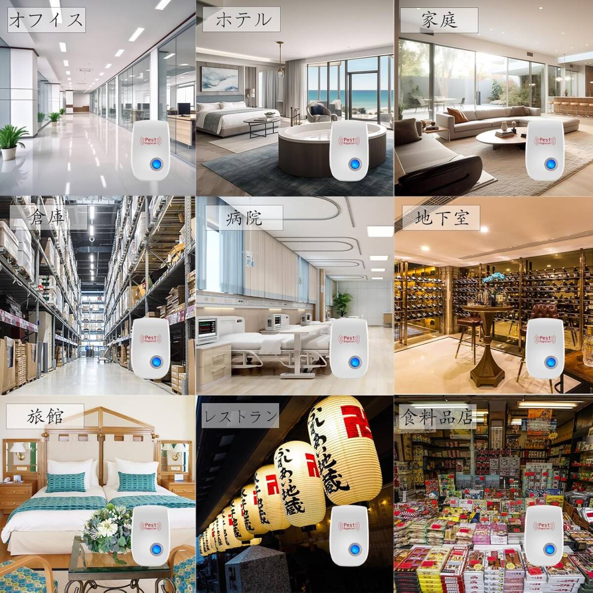 【広い作用範囲】害虫駆除器は全方位にパルス音波を発射して、360度の音波が立体的にサラウンドして、有効範囲120㎡(約80畳)。家庭、レストラン、食料品店、倉庫、地下室、オフィス、ホテル、旅館など様々な場所で使用可能です。(超音波が障害物(主に壁)に遮られると効果が減ります、各部屋に1台を推奨します。)