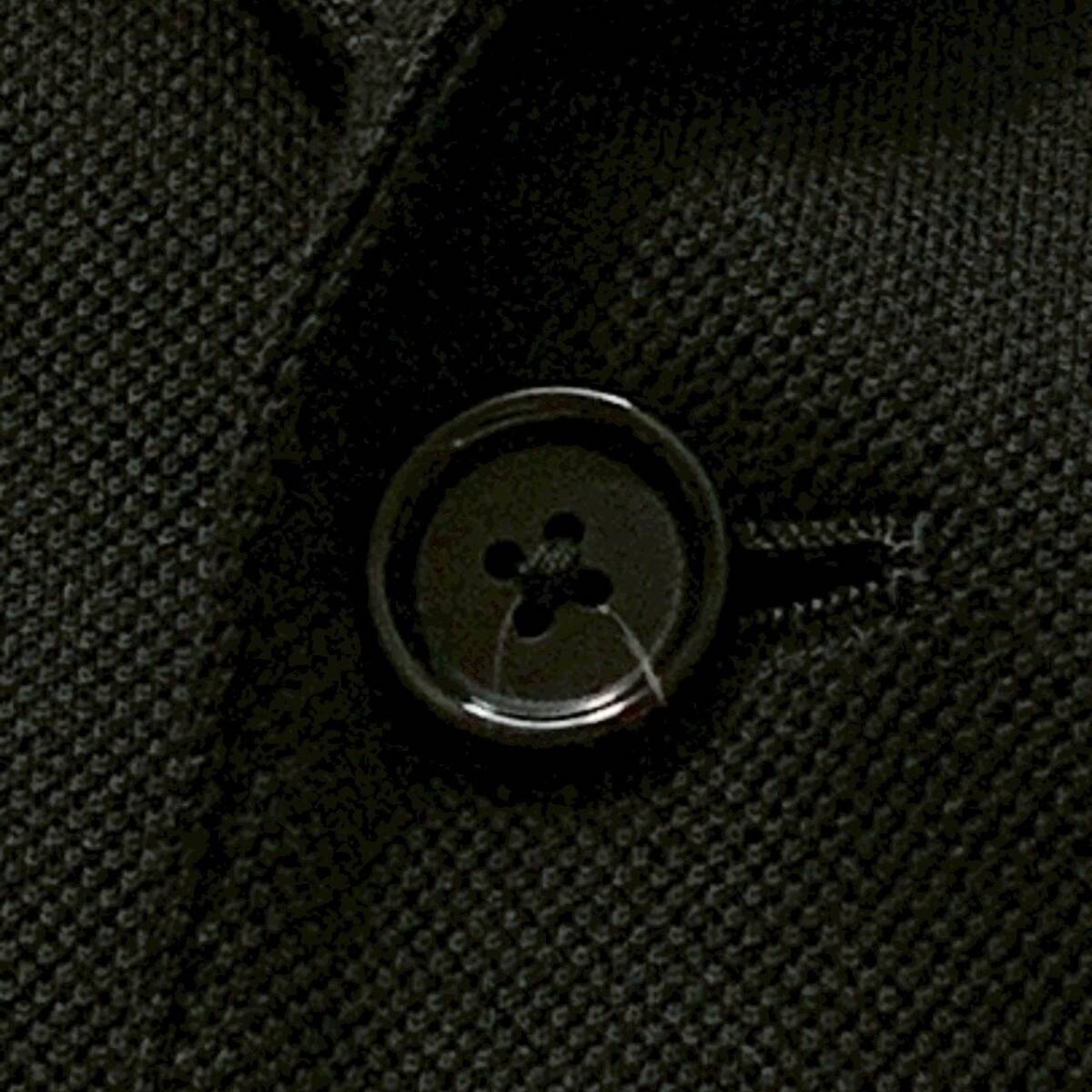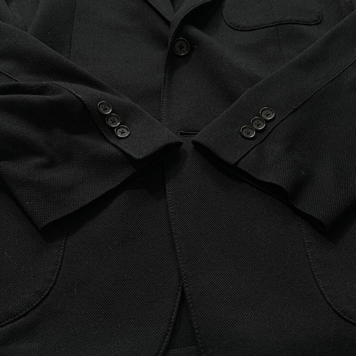 シンプルかつ上品なデザインのブラックジャケット。表地はコットン×ポリエステル混で、程よいハリ感と軽やかさを兼ね備えています。オンオフ問わず着用可能な万能アイテム。