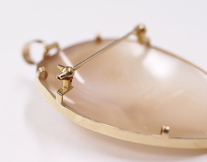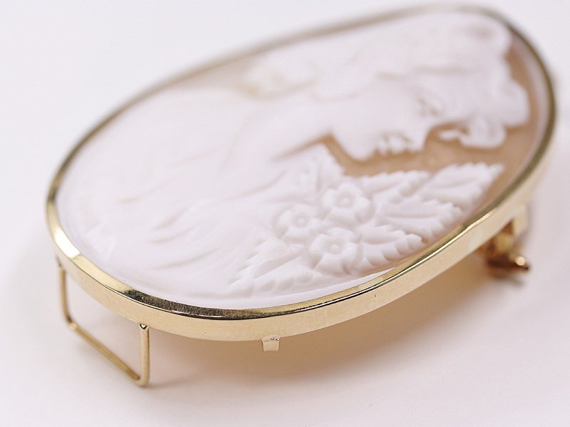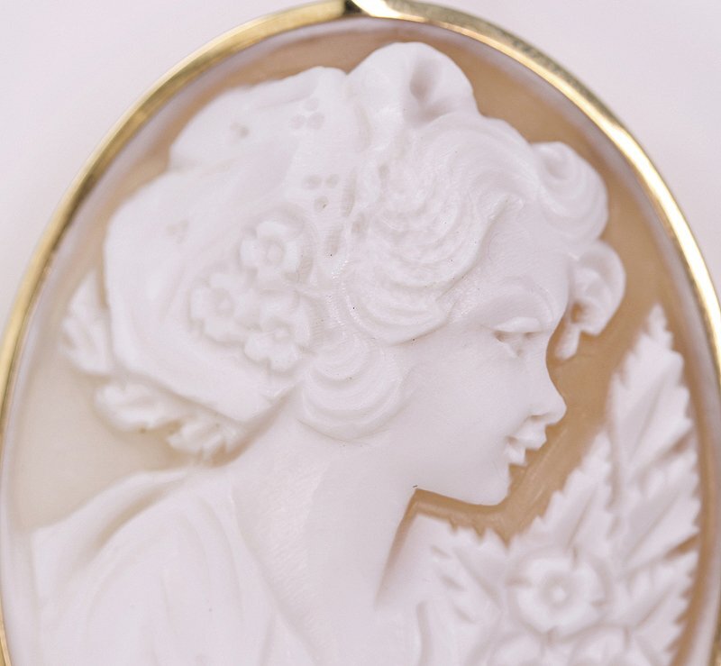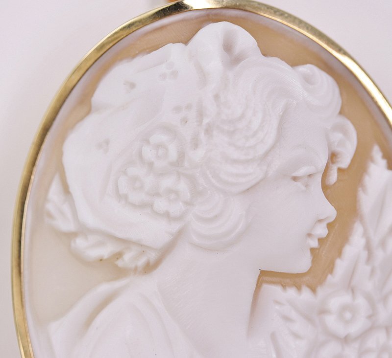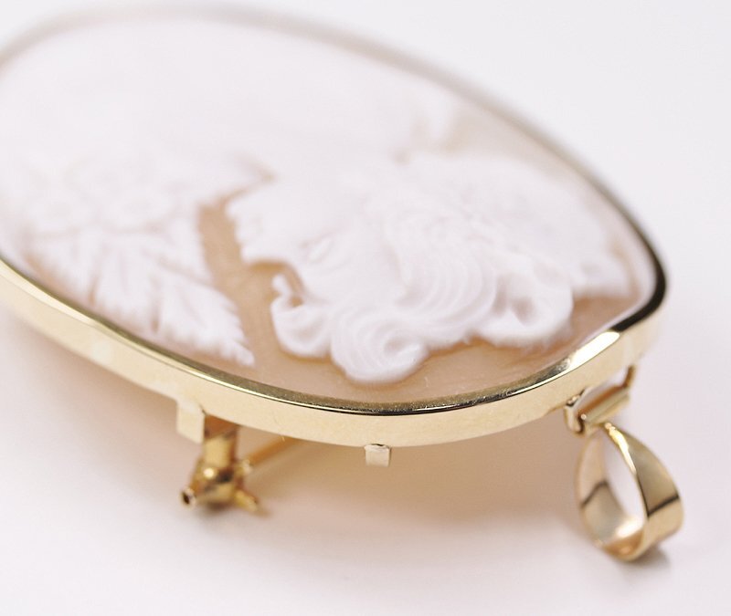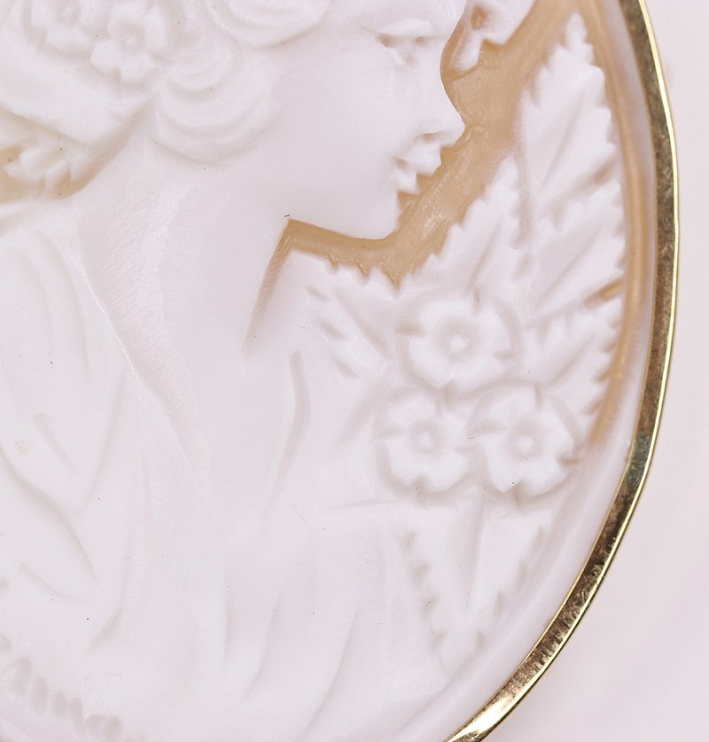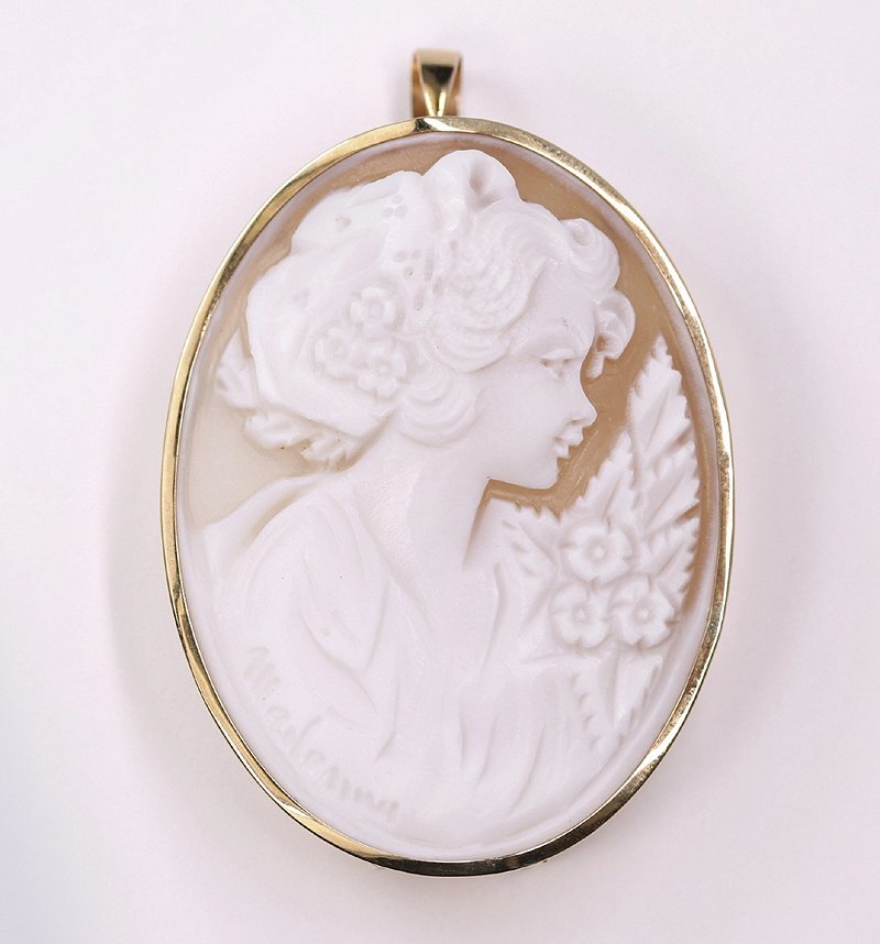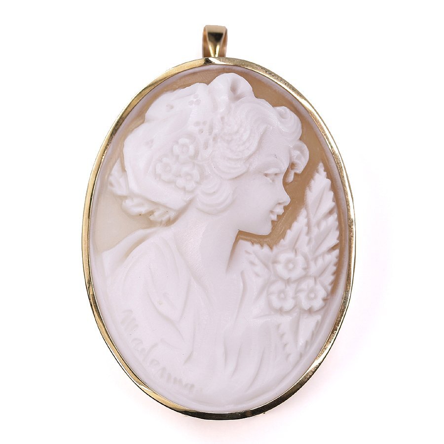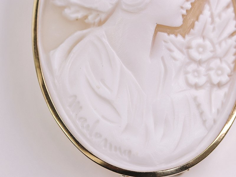 ハンドクラフトにより天然の貝より創りだされる芸術。白の層と褐色の層の境界を巧みに用い、彫り上げて意匠を浮かびあがらせるシェル・カメオ。本作品には神話の女神を想起させる女性の横顔が浮き彫りされています。イタリアのカメオ作家【ラファエレ・マドンナ / Raffaele Madonna】の作です。作家サイン「Madonna」がレリーフに刻まれ、後面をみますとそちらには別サインが入っております。