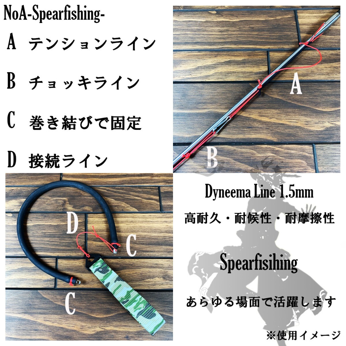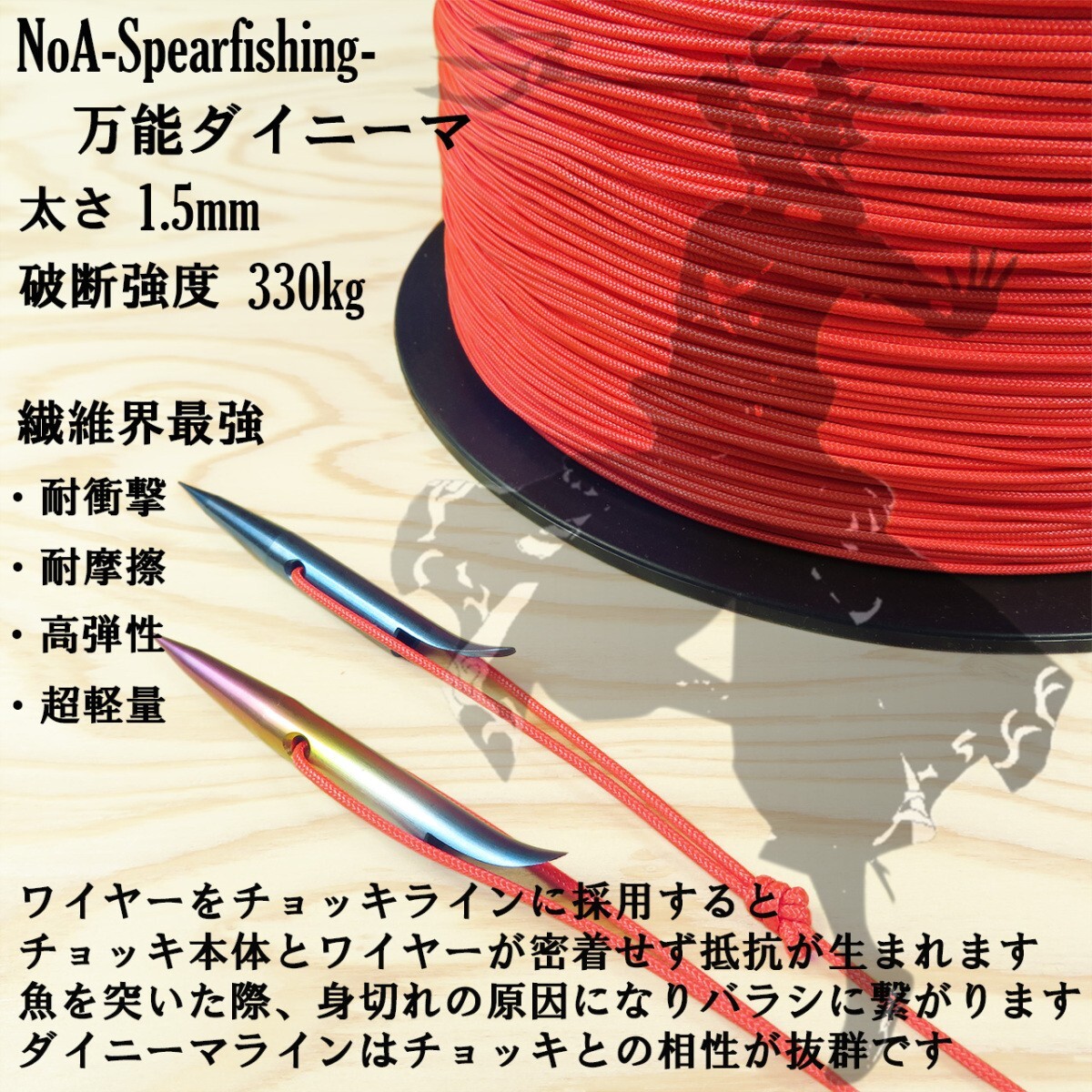 商品説明 | ◆仕様 ・太さ:1.5mm ・長さ:500cm ・破断強度:330kg ・材質:ダイニーマ ・耐候性(海水に強い) ・屈曲疲労性(折れや捩れに強い) ・耐摩擦性 ・耐薬品性 ・超高強力 ◆商品説明 ★用途 ・チョッキライン ・テンションライン ・巻き結び ・レストタブの作成 ・ウィッシュボン用ライン ・各種接続ラインに ※万能ダイニーマ 当店のダイニーマライン1mmと2mmの中間的ポジションで双方の用途を両方担います 海水(耐候性)及び摩擦(耐摩擦性)に強く、そして折れや捩れに強い(屈曲疲労性)、加えて充分すぎる強度と耐久性を備えており、スピアフィッシングとの相性は非常に良いです あらゆる箇所をダイニーマラインで賄えば、交換サイクルも長くなり抜群のコストパフォーマンスを発揮します ※ダイニーマとは あらゆる繊維の追随を許さない最強の繊維と呼ばれています 屈曲疲労性に優れています 鉄の約8倍である超高強力に加え、水に浮く軽さを併せ持ちます 耐摩擦性、耐薬品性、耐候性にも優れています 様々なシーンで活躍するダイニーマの世界全体での生産能力は3万トン以上と言われています 船舶用ロープや釣り糸などの漁具、防護服やヘルメットなどの安全用具、土木や建築資材の補強材としても使われています 強度や耐久性、耐候性や屈曲疲労性など、スピアフィッシングに最適な素材です 融点が150℃と低いため、ライターで炙ると切断面を綺麗に保護することができます |