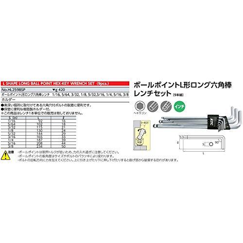 「京都機械工具(KTC) ボールポイント L型 ロング六角棒レンチ セット 9本組 HL259BSP」▼4989433828961▼(商品説明)・シルバー HL259BSP・製品型番:HL259BSP・セット内容:1/16、5/64、3/32、1/8、5/32、3/16、1/4、5/16、3/8(インチ)・インチサイズの9本組六角棒レンチセットです。・狭く奥深い個所にあるねじの締緩作業が容易です。・この商品はレンチ一本単位での販売はしておりません。説明 ●奥深い箇所に取り付けてある六角穴付ボルトの着脱に便利です。●斜め回転作業が可能です。