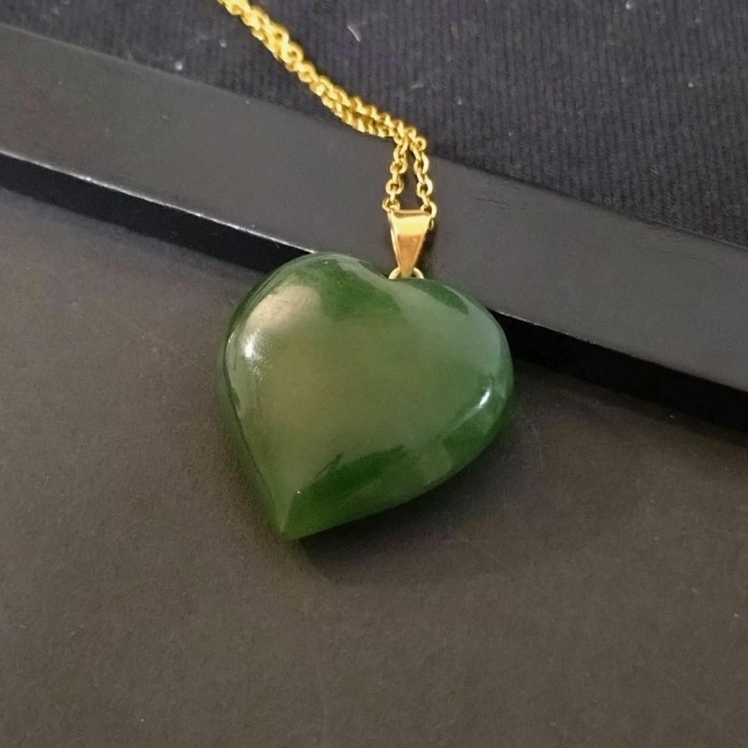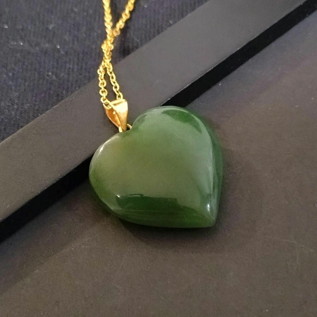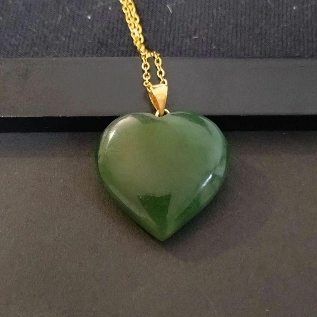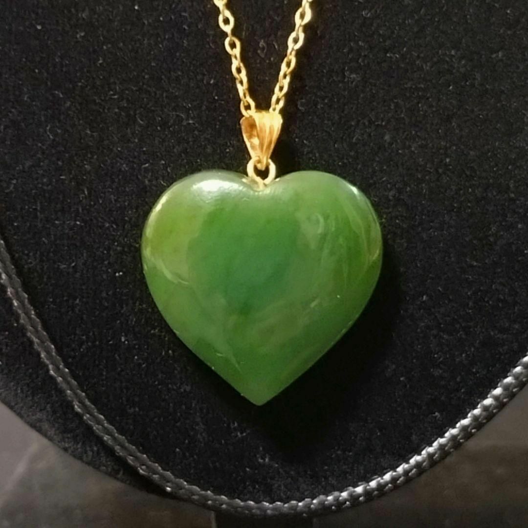 深い緑の美しい翡翠(ネフライトジェイド)をハート型にした可愛らしいネックレス、ペンダントです!
