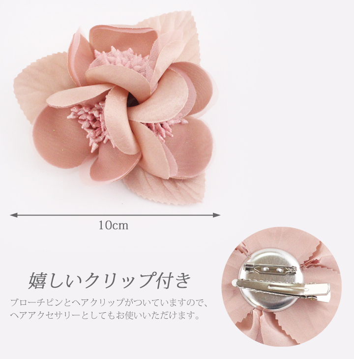 | 商品説明 | しっかりとした生地とシフォンのダブル構造で立体的に♪ 小ぶりで上品なデザインがセレモニーなどのスーツスタイルにピッタリ!! ピンクやベージュは、春らしい色味ですので入学式や結婚式に・・・ 紺やグレーは卒業式に花を添えて・・・ ヘアクリップ付ですので、ヘアアクセサリーとしてもお使い頂けます。 |