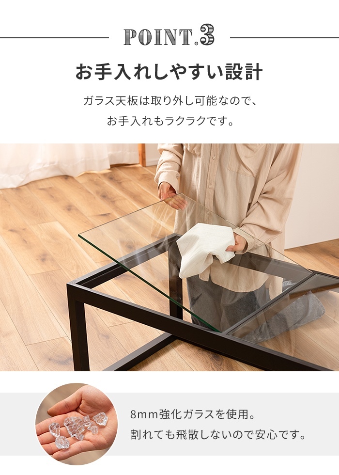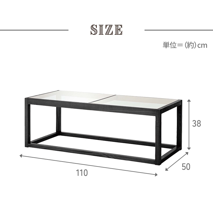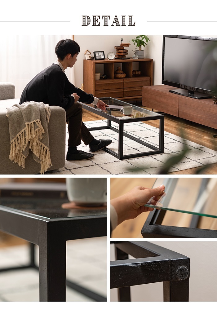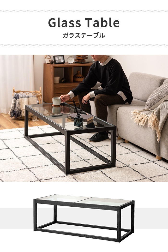 | クリアガラス天板とアッシュ天然木を組み合わせたリビングテーブル。 スクエアなデザインと視界を遮らないガラス天板は、圧迫感なく空間をスタイリッシュに演出します。 |