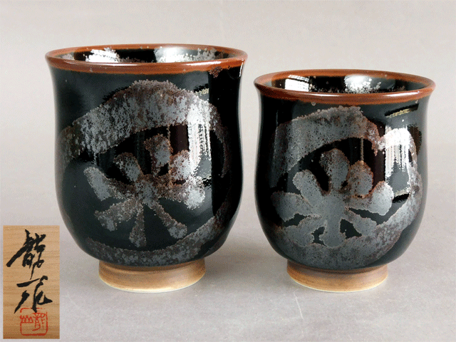 青木 龍山 天目 花紋 組湯呑 二客 文化勲章受章
