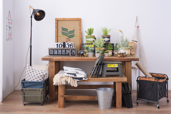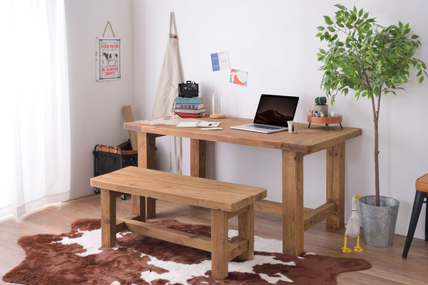 重厚感・重量感のある風合いが魅力的なテーブルとベンチ。店舗の展示用什器としてや、デザインオフィスでの会議用テーブルとしてなど、独特な魅力ある雰囲気を作り出してくれます。