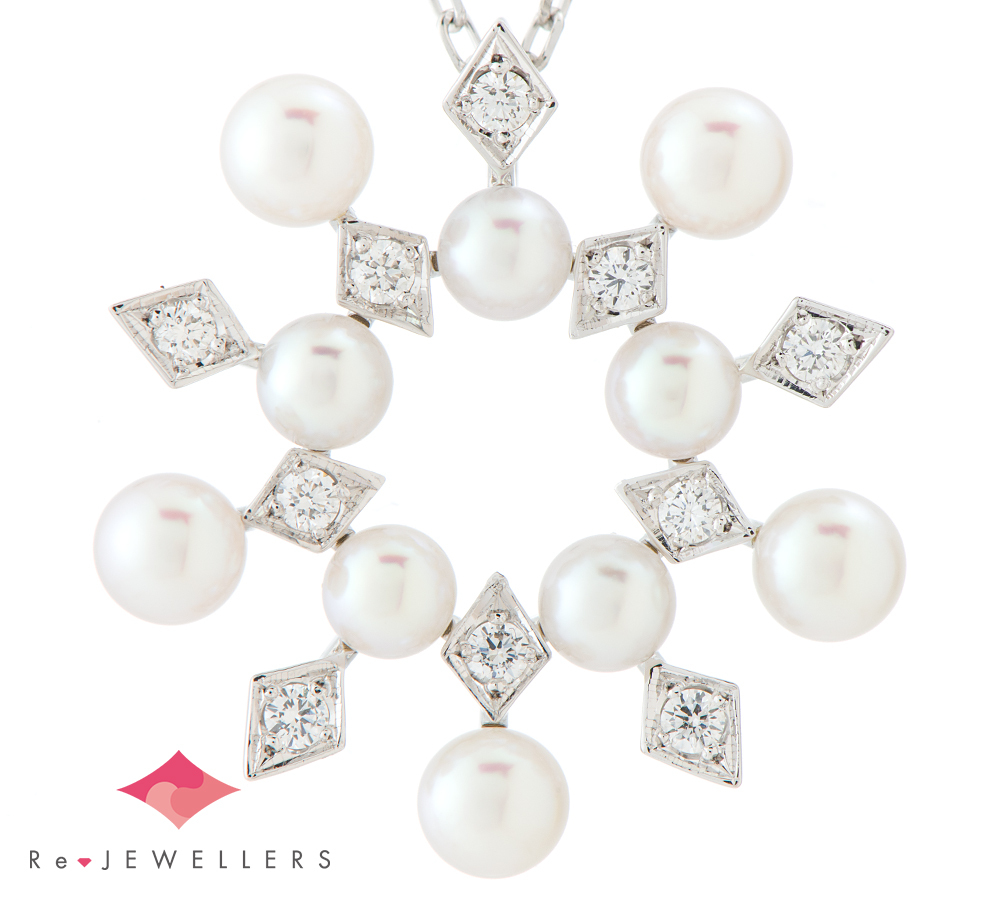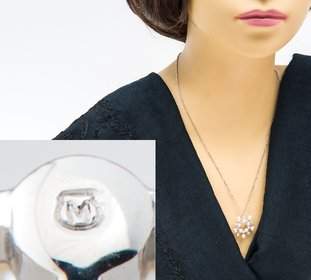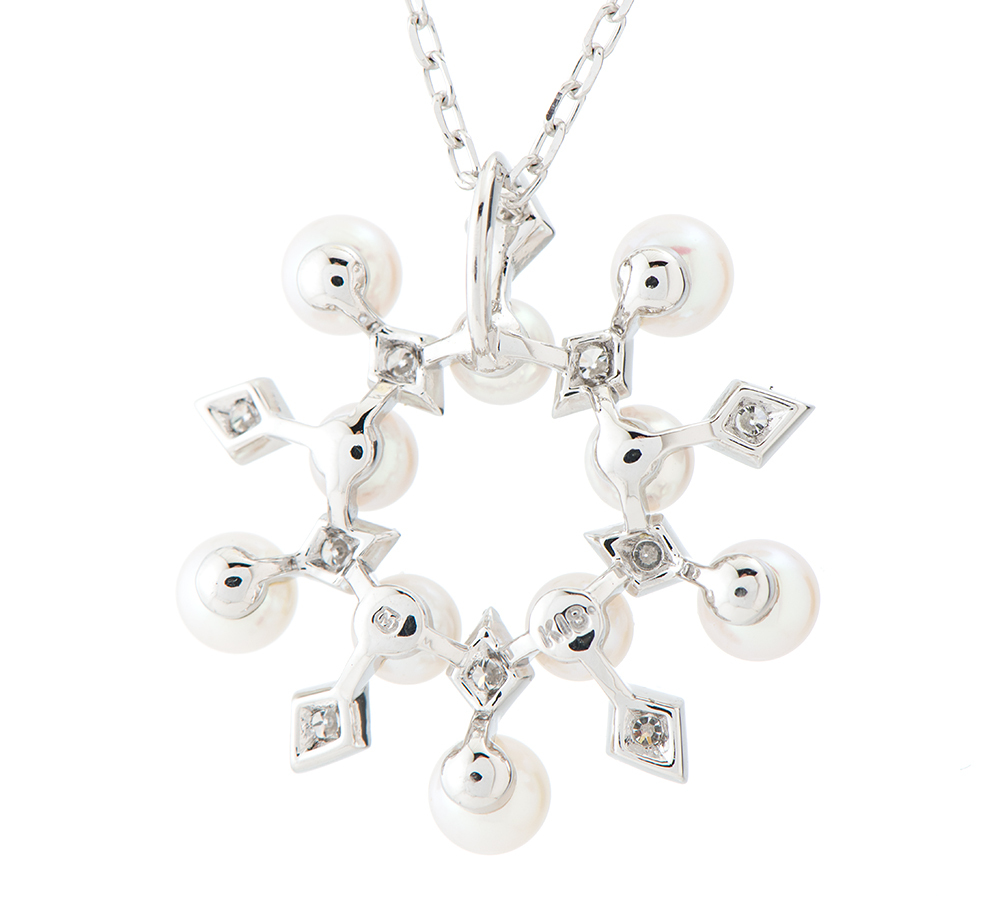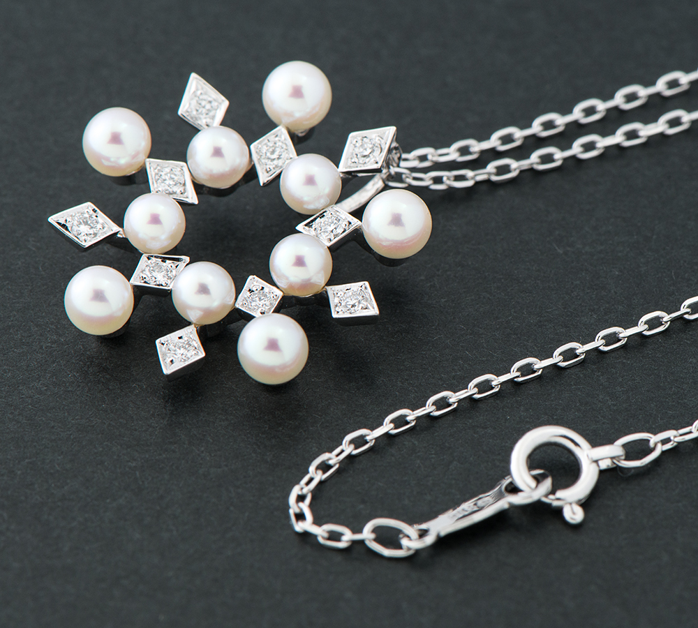 素材の素晴らしさだけでなく、デザイン性の高さが光るミキモトのペンダント・ネックレス。小粒ですが大変美しい干渉色とテリを持つアコヤ真珠をダイヤモンドと併せ、上品に仕上げた雪の結晶のようなペンダントトップです。空間を活かして細やかなパーツをセットした、フェミニンな印象の上質なジュエリーです。