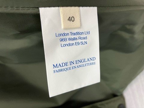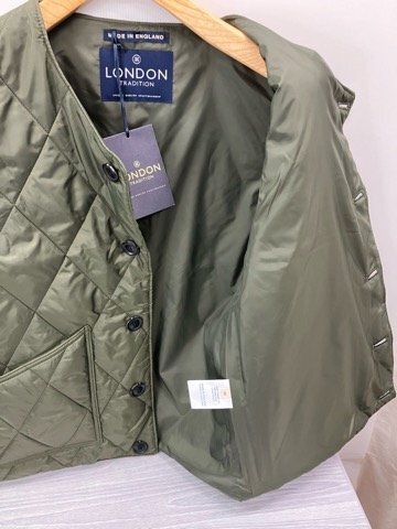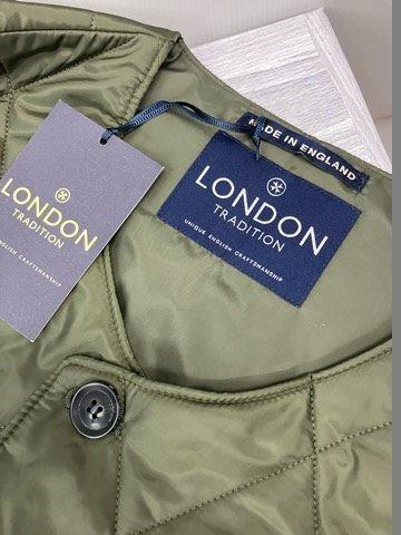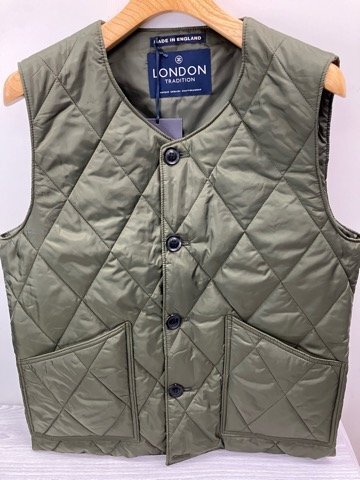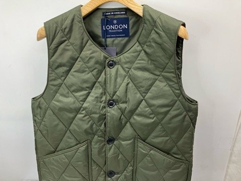 送料無料!キルティングベスト スリーブレスブルゾン 防風 防寒 40表示 L相当 緑系カーキ LONDON Tradition★未使用格安!