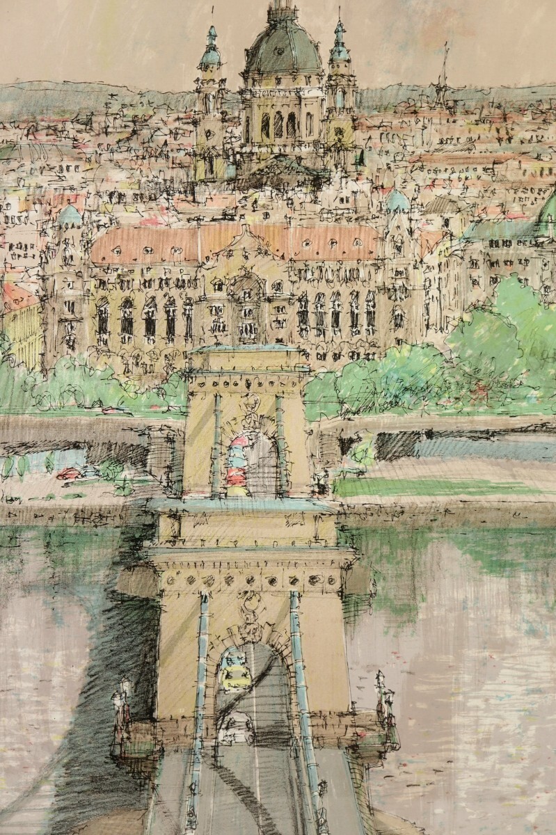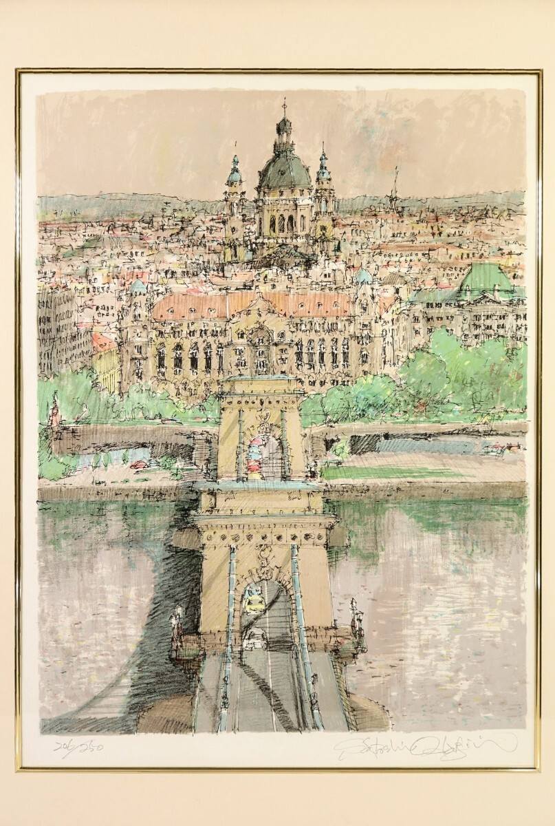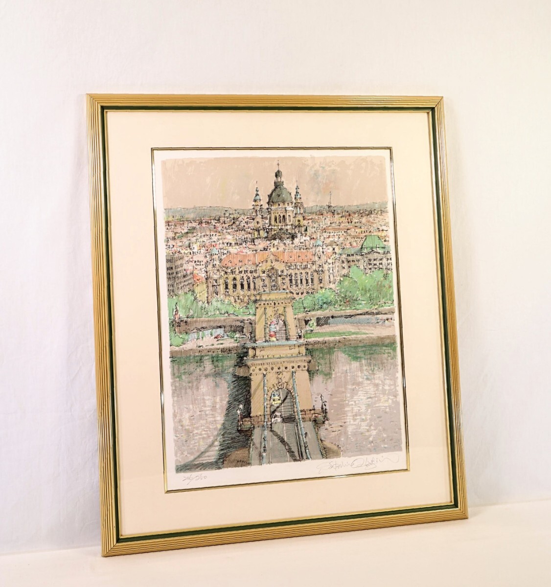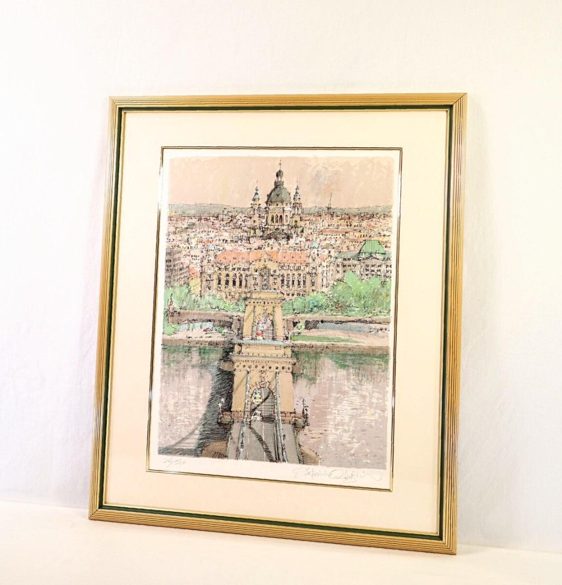 真作 小田切訓 リトグラフ「ドナウの橋」画 40×53cm 北海道出身 無所属 洗練されたシャープな描線と透明感ある色彩 セーチェーニ鎖橋 9583