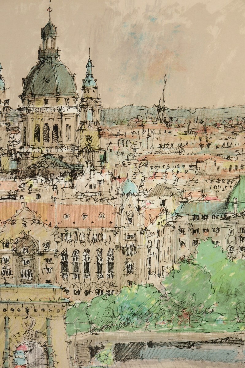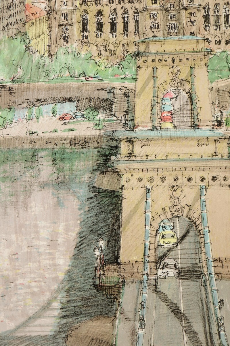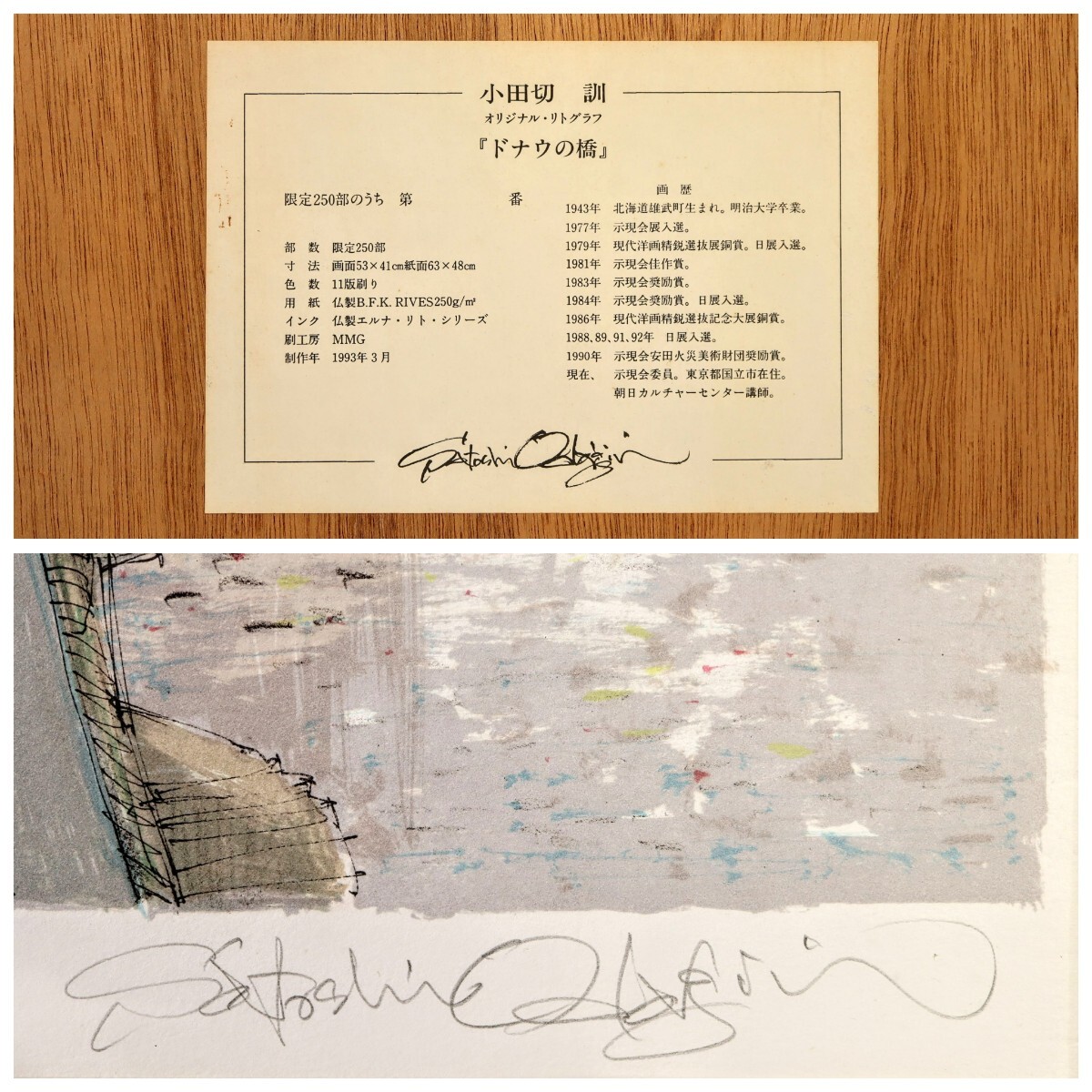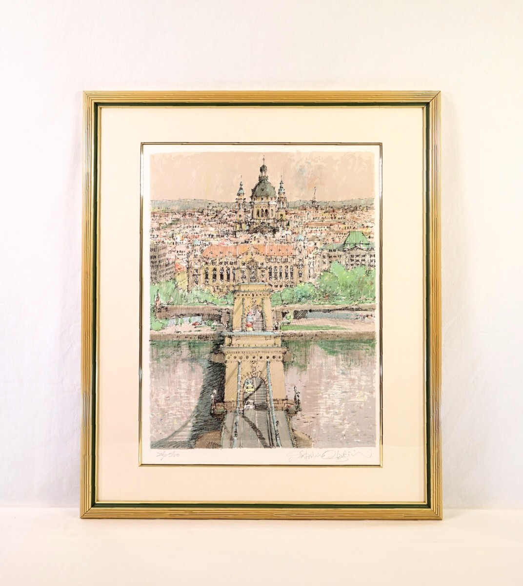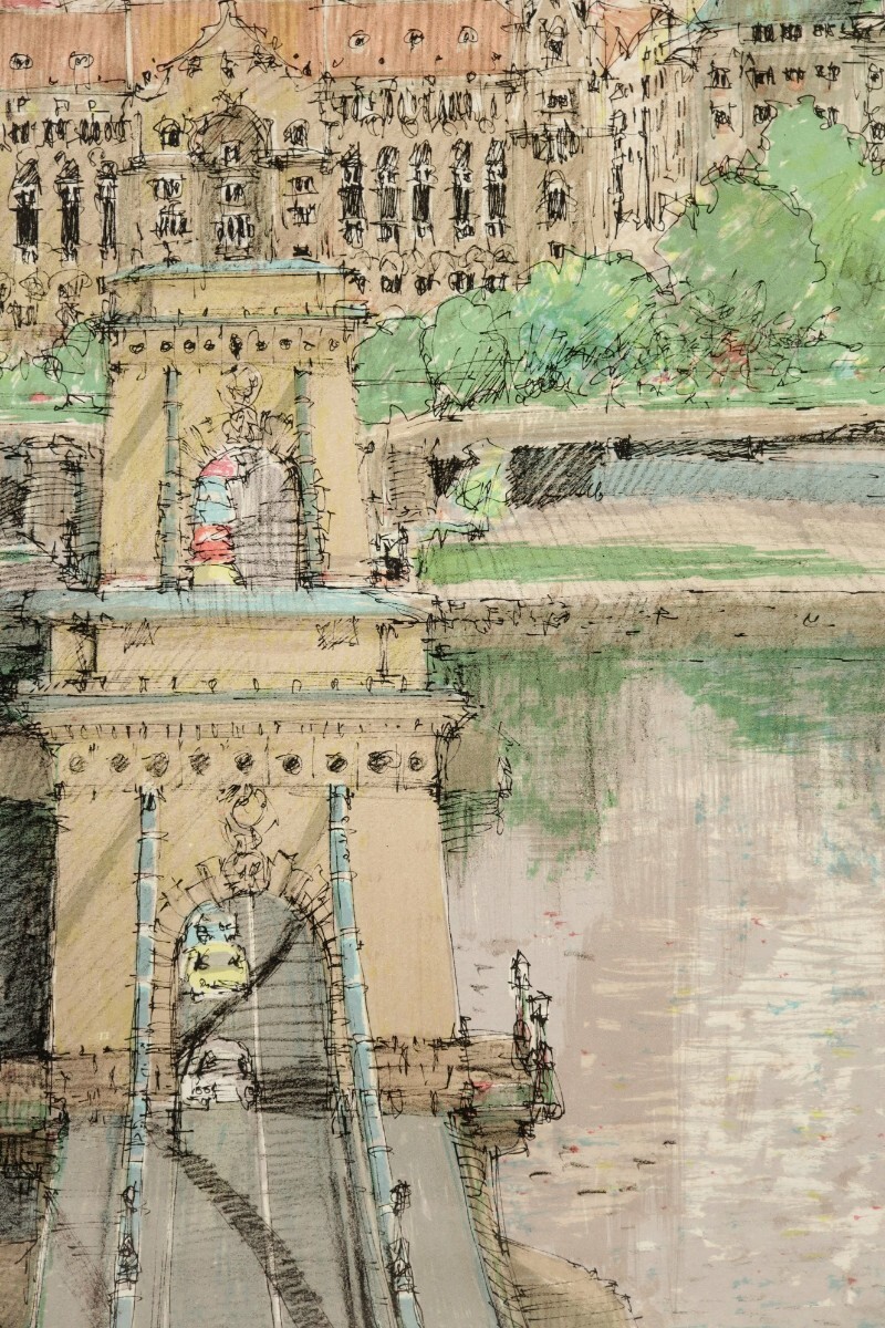 真作 小田切訓 リトグラフ「ドナウの橋」画 40×53cm 北海道出身 無所属 洗練されたシャープな描線と透明感ある色彩 セーチェーニ鎖橋 9583