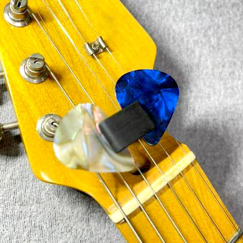 ピックを最大2枚挟んでストックが可能で、チューニングやトーンに影響を与えません。幅広いタイプのギターやピックに適合します。