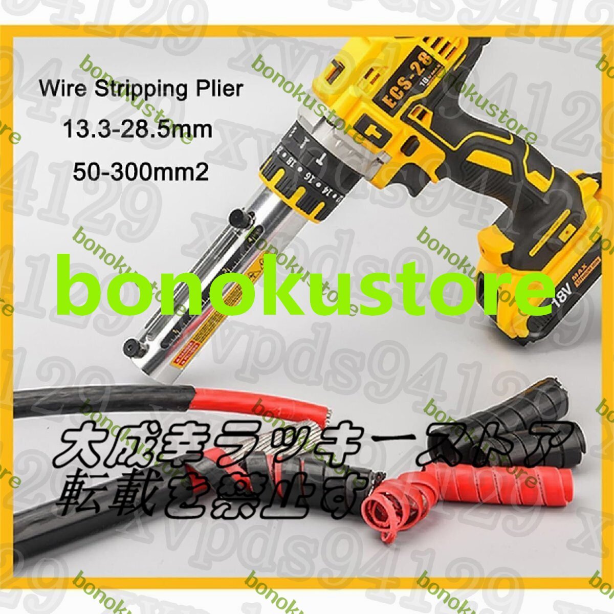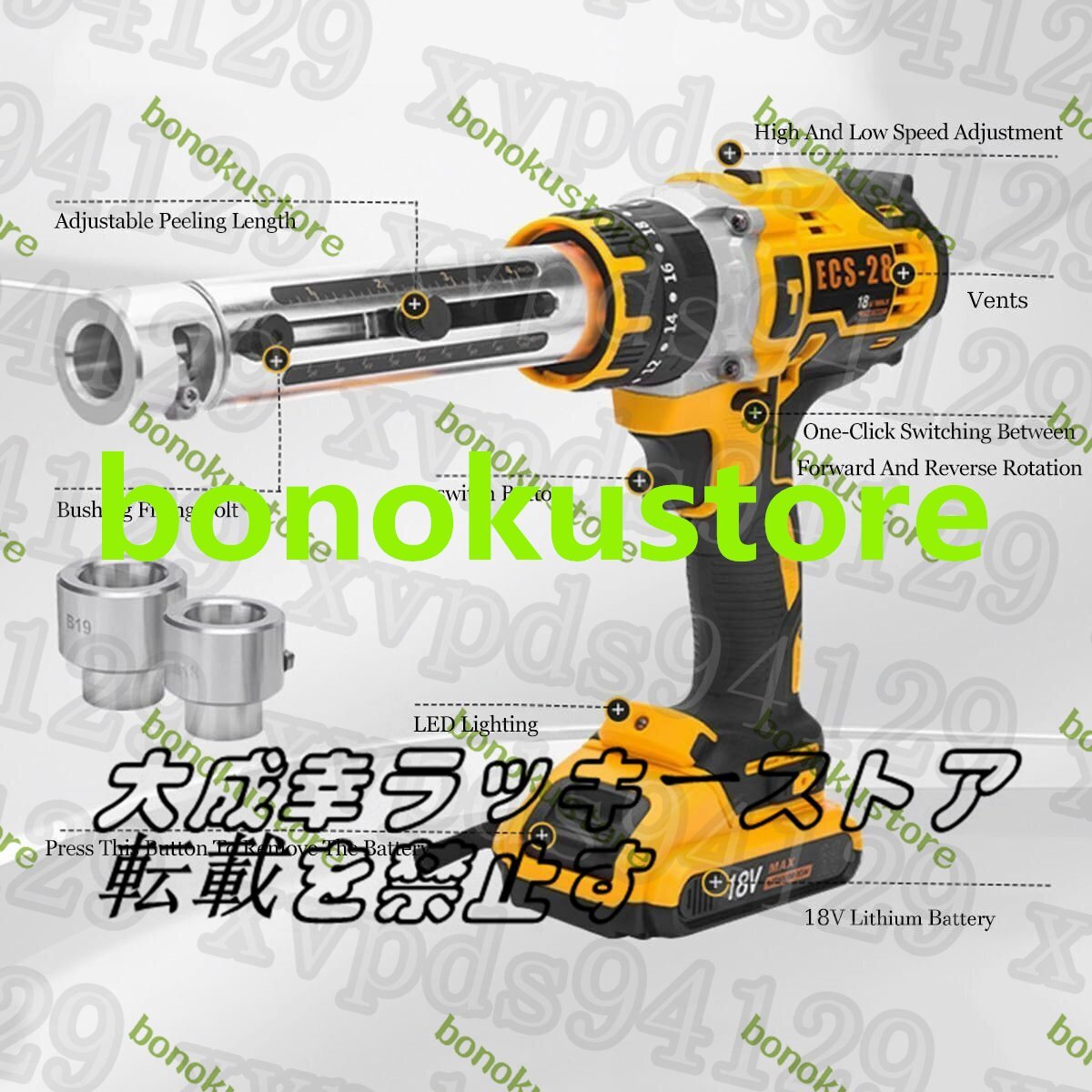 電線ストリッパー、ポータブル充電式ワイヤー皮むき機、50-300mm2、高速ワイヤーストリッパー、13.3-28.5mm、剥離深さと長さを自由に制御?特徴?ポータブル:このツールは簡単に持ち運びできるように設計されているため、さまざまな作業場所に持ち運ぶことができます。?充電式:充電式バッテリーが搭載されているため、頻繁に電池を交換する必要はありません。?ワイヤサイズ範囲: 50?300mm2の範囲のワイヤで使用するように指定されています。?ケーブル径範囲:直径13.3~28.5mmの範囲のケーブルの皮むきが可能です。?クイックストリッピング:この電線ストリッパーは、ワイヤを素早く効率的に剥くように設計されています。?説明製品名: 電線ストリッパーバッテリー: DC18V/2.0Ah リチウム電池正味重量: 1.6kg総重量:6.0kg剥離範囲:φ13.3mm~φ28.5mm(50~300mm2)?アクセサリー電線ストリッパー*1バッテリー*2充電器*1