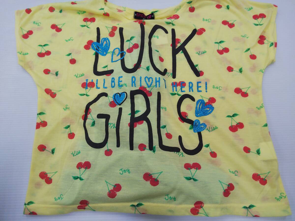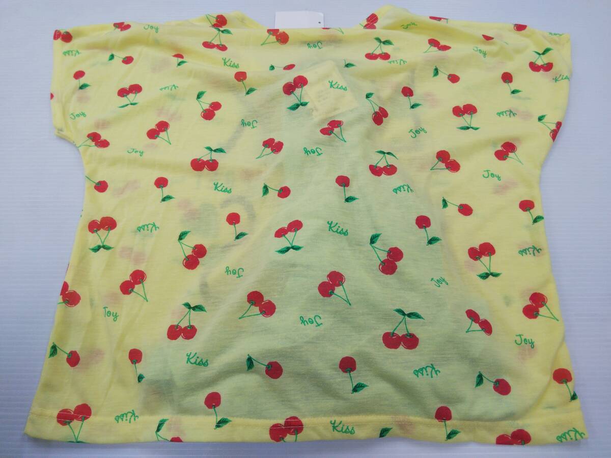 レモンイエローにサクランボ・ブルーラメの絵文字柄で、肩や裾から見える水色が涼し気です。