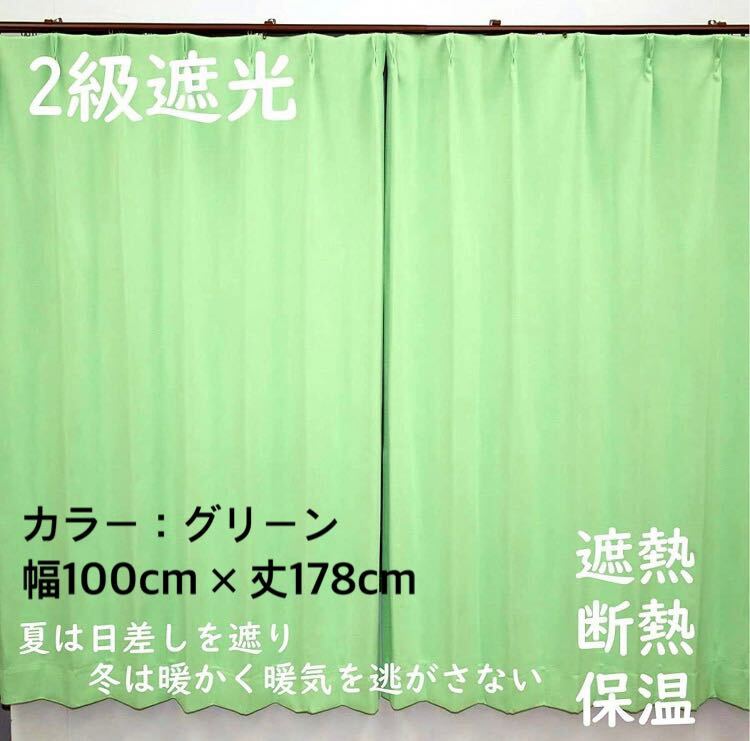 2級遮光カーテン 断熱保温 形状記憶効果 グリーン  幅100cm×丈178cm アジャスターフック タッセル付 2枚組 洗濯可 0913 ④
