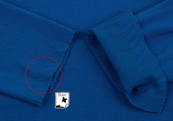 コンディション | 若干の透け感があります。首周りに擦れ、右脇に薄シミ・右袖に引っ掛け、右袖先・前に点シミがあります(写真参照)。その他目立ったシミ、汚れ、ほつれ等はありません。クリーニング済み ※商品の詳細写真はこちらよりご確認頂けます。 | ||||||