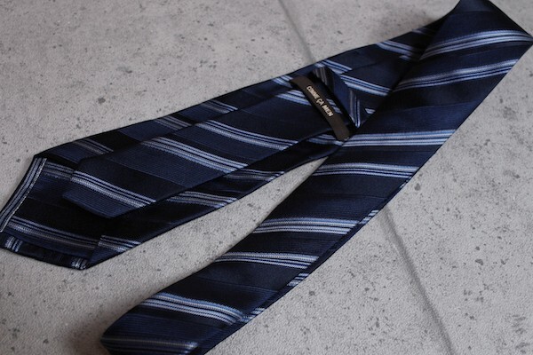 ネクタイの柄は使いやすい柄。タイバーは幅が細いタイプ。 シンプルでありながら、コムサ・メンらしい存在感があります。