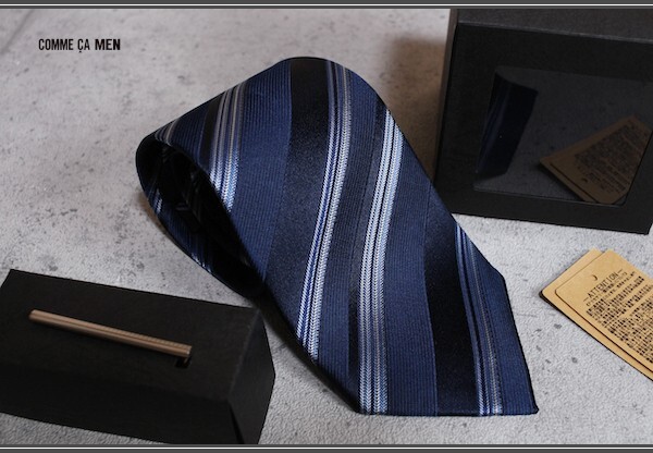 新品 コムサメン レジメンタル柄 ネクタイ タイバー キューブBOXセット 濃紺/定価1.6万円/COMME CA MEN/ネクタイピン