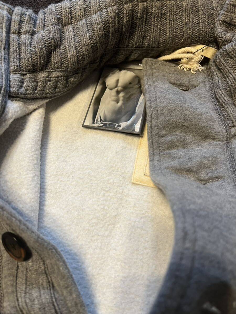 このグレーのカーディガンスタイルのスウェットは、ボタン付きで、フロントにポケットがあり、実用性とスタイルを兼ね備えています。鹿のロゴ刺繍が施されており、ブランドのアイデンティティを強調しています。