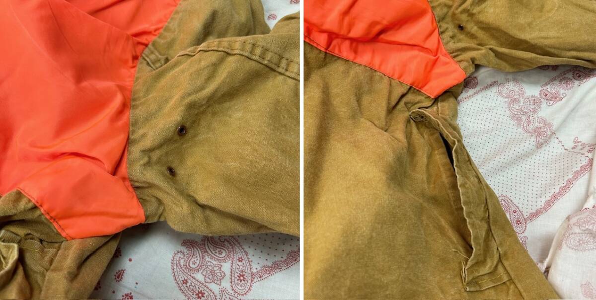 ●商品説明・・・アメリカ古着になります。70年代頃~のオールド・ヴィンテージのSAFTBAKのコットンダック生地(キャンバス生地)にオレンジナイロンの切替え付きのハンティングジャケット・カバーオールです。一枚生地で、秋や春にカバーオール感覚(冬もスウェットなどの上にアウターとして)で着ていただける一着です。。素材はコットン(オレンジ部分はおそらくナイロン)で、ハンティングジャケットですので、オーバーコート並のゆったりした大きめな作りになっており、タグは消えてしまっていますが、ゆったりした動きやすい作りのL程度のサイズ感かと思います。