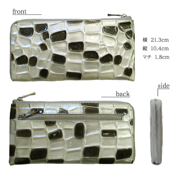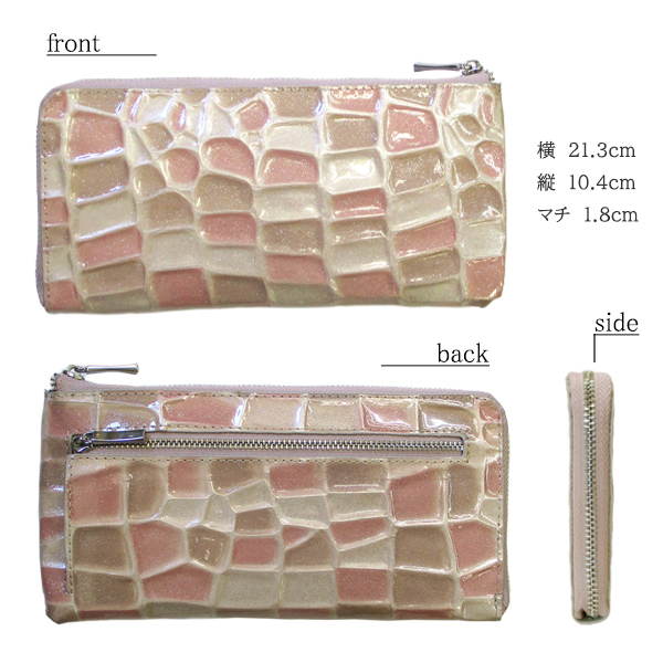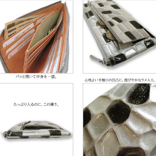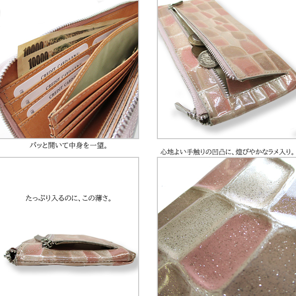 | 心地よい手触りの凹凸に煌びやかなラメが光る、L字ファスナーの長財布。 表面はエナメル加工で、多少の水滴もサッと拭き取れます。 アピールポイントは何と言っても収納力。 クレカやポイントカードがすべて入ってしまうほどのカードポケットに、お札入れ等の大きなフリーポケットが多く、自由に収納できます。 小銭や小さな鍵、スマホまで入る万能なお財布は、まるでミニバッグ。 ミニマリストにはピッタリ。 L字を開くと中仕切りがあり、仕切りの両側にもカードを収納できます。 全体が見やすく、ポケットが大きいのでお札の出し入れもスムーズ。 手放せないお財布です。 ■カラー:ブラック・ピンクベージュ・ブルーよりお選び下さい。 ■サイズ(約):縦10.4cm×横21.3cm×マチ1.8cm (商品によっては多少の誤差があります。予めご了承下さい。) ■素材:外側/牛革(クロコ型押しエナメル加工)、内側/ボンテッドレザー ■仕様:ファスナー開閉、小銭ポケット×1、札入れ×2、フリーポケット×2、カード入れ×24、ファスナーポケット(外側)×1 ■付属:Maturi専用BOX ■新品未使用 ※一部共通画像使用 【ご注意】 ※商品によって柄は異なります。柄の指定はできません。 ※新品未使用ですが、稀に製造過程による柄のぼやけ・天然皮革のシワによる傷のようなラインがございます。 細かい傷や汚れについても、不良の対象にはなりませんので、予めご理解下さい。 ※ご覧のモニターやブラウザの設定、照明等により、画像と実物の色合いが若干異なる場合がございます。 これらについては予めご理解頂いた上でご購入下さい。 | |
