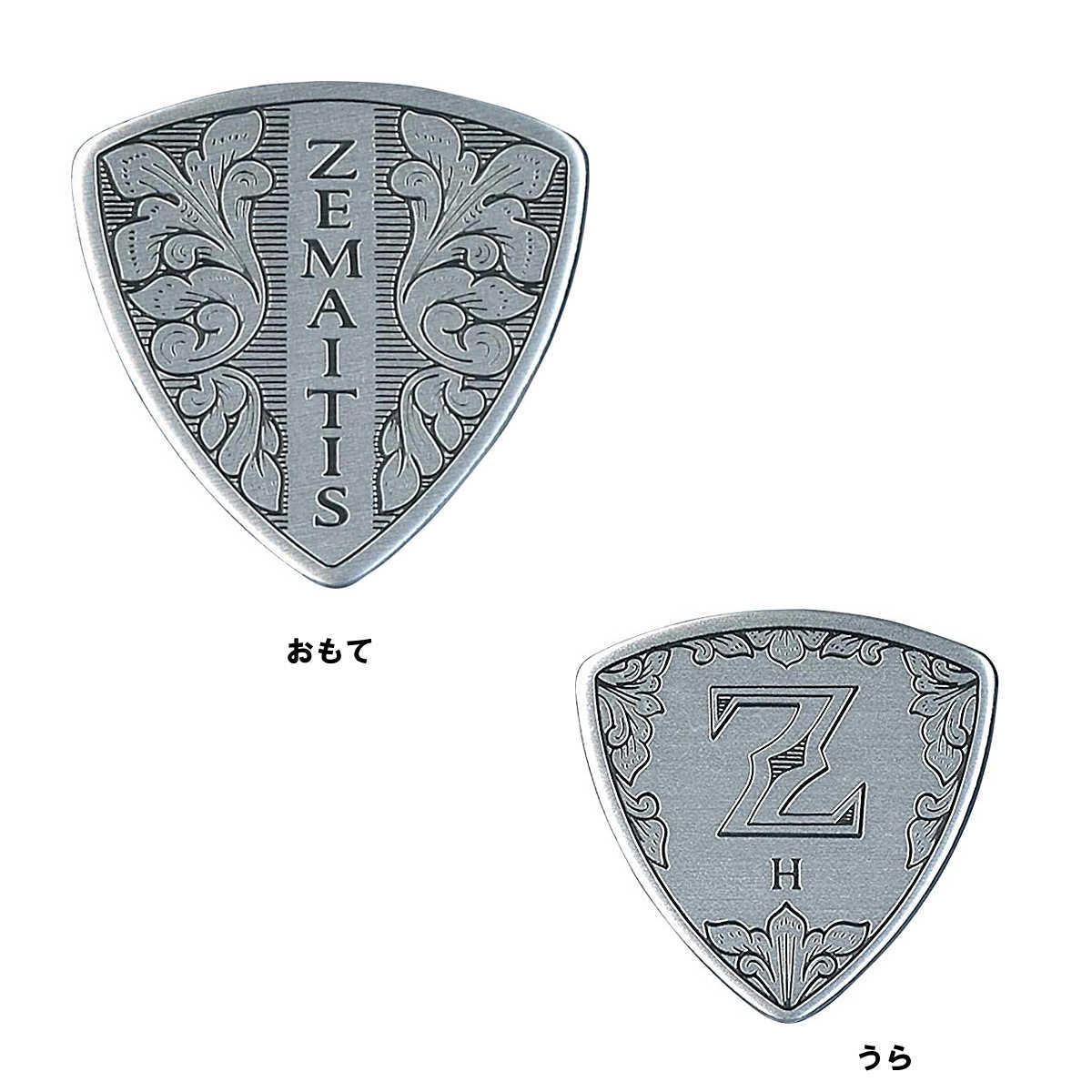 メタルフロントのデザインを基にしたこのピックは、スタンダードなセルロイドのピックに蒸着フィルムを圧着させることで、メタルフロント・ギターの重厚な質感を再現しています。
