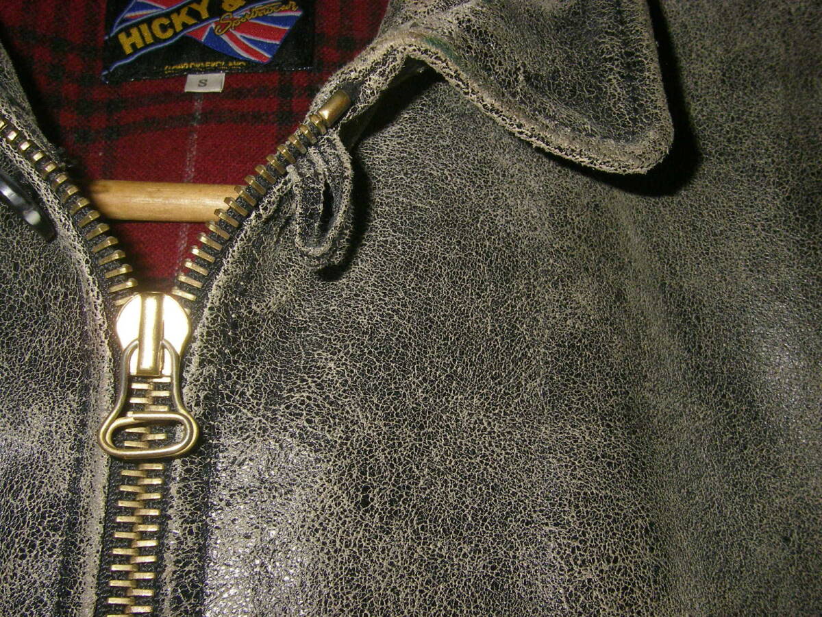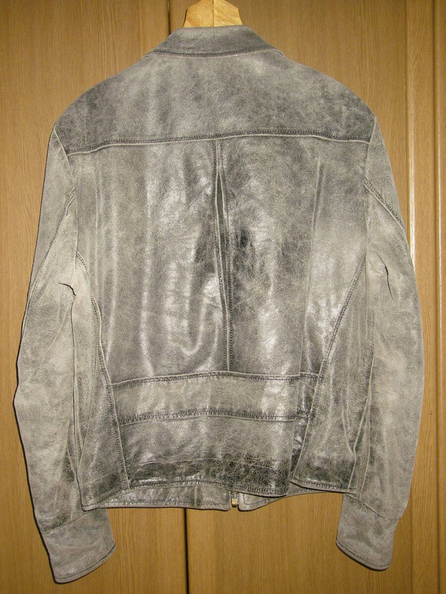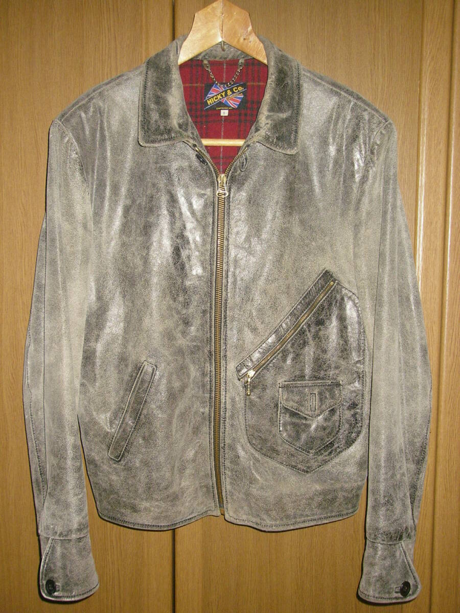 シップスで購入、HICKY&Co(英国製、イタリア製両方の表記がございます)のグレー系のシングルの革ジャンです。牛革です。ヴィンテージ、アンティーク加工でいい味出ております。前ZIPはririZIPです。若干の使用感ざいますが、特に大きなダメージも無く、状態良好です。あくまでもUSED品ですので、神経質な方、USEDレザーのご理解の無い方、入札しないで下さい。メーカーサイズ表記Sサイズで、平置き採寸で、肩幅48,5センチ、袖丈64センチ、着丈65センチ、脇下身幅52,5センチです。素人採寸ですので多少の誤差はお許し下さい。