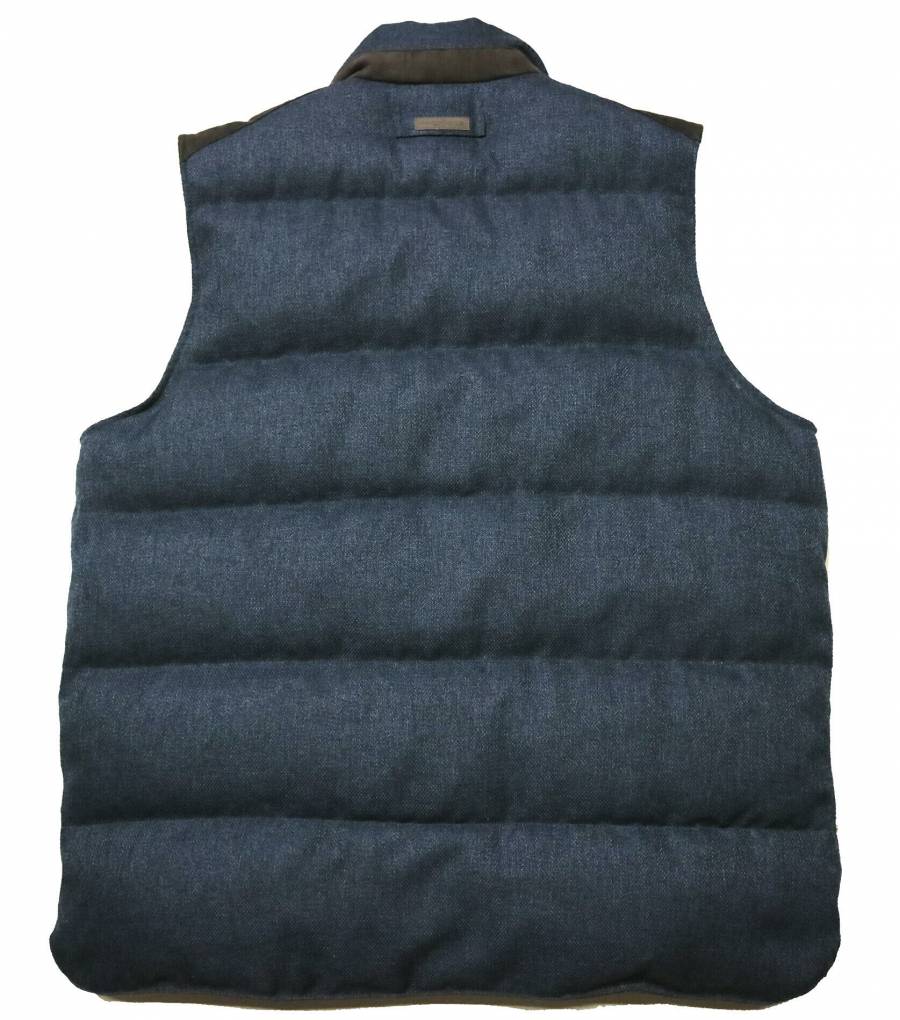 ・見た目はウール系生地に見えますが、生地表面に起毛感がなく扱いやすいポリエステル素材です。フェイクスエードもポリエステル地でもちろん色移りなどはございません。程よく厚手で暖かな作り、落ち着いた品の良いダウンベストです。内ポケットは左胸の内側に1つです。