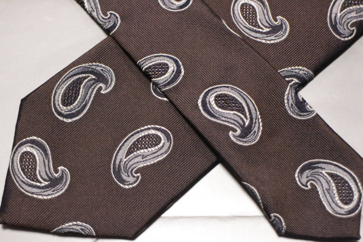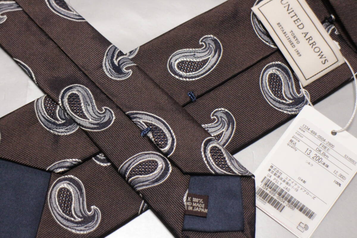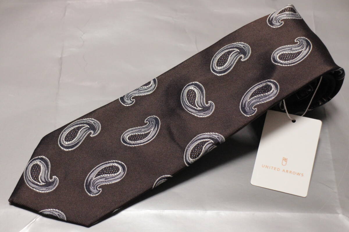 ユナイテッドアローズ新品ネクタイ超シック艶ブラウン*シルバー*グレー小紋ジャガード織ペイズリー柄フルハンドメイド