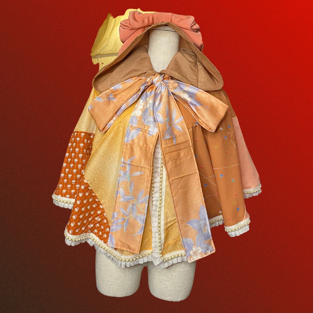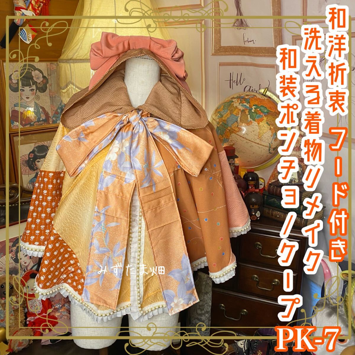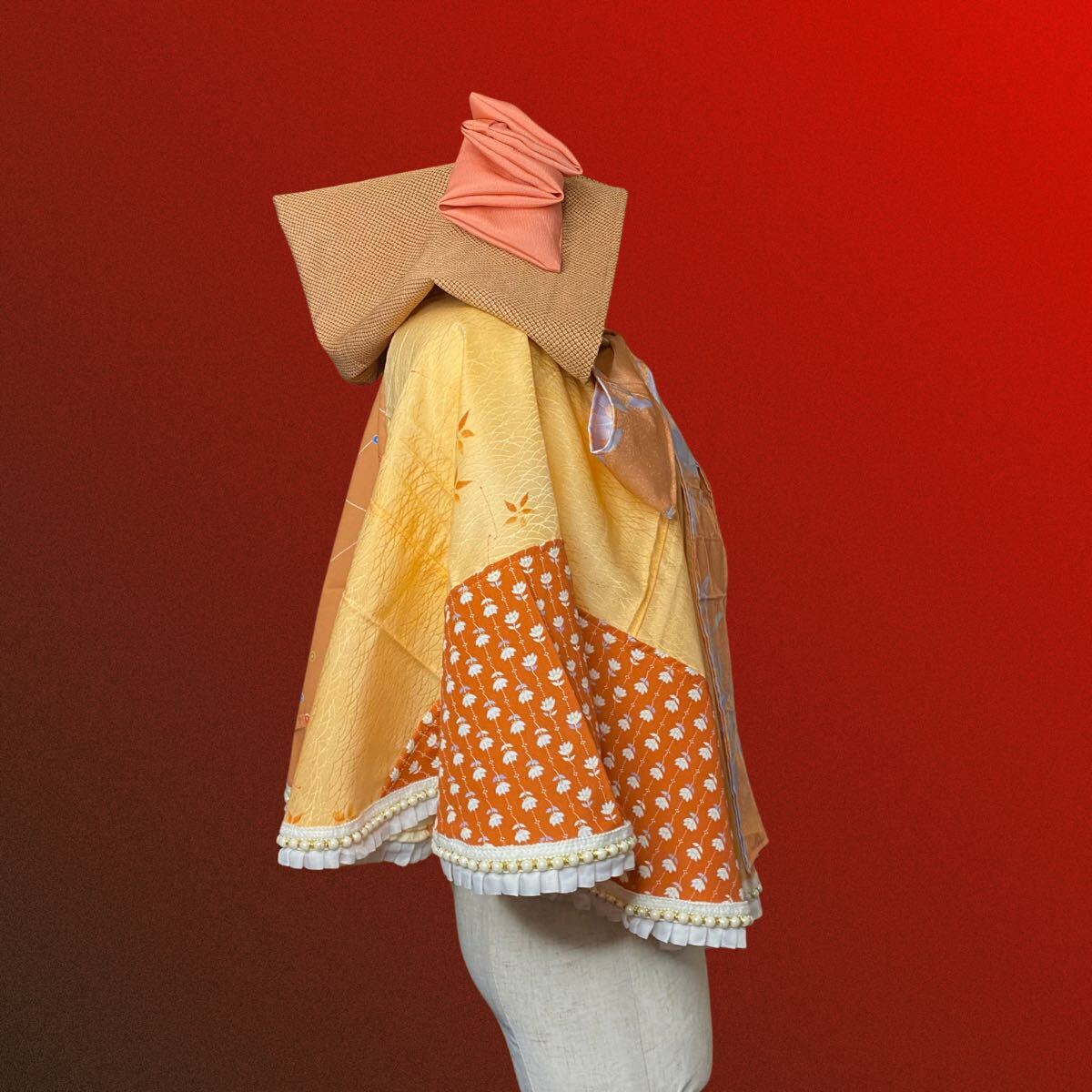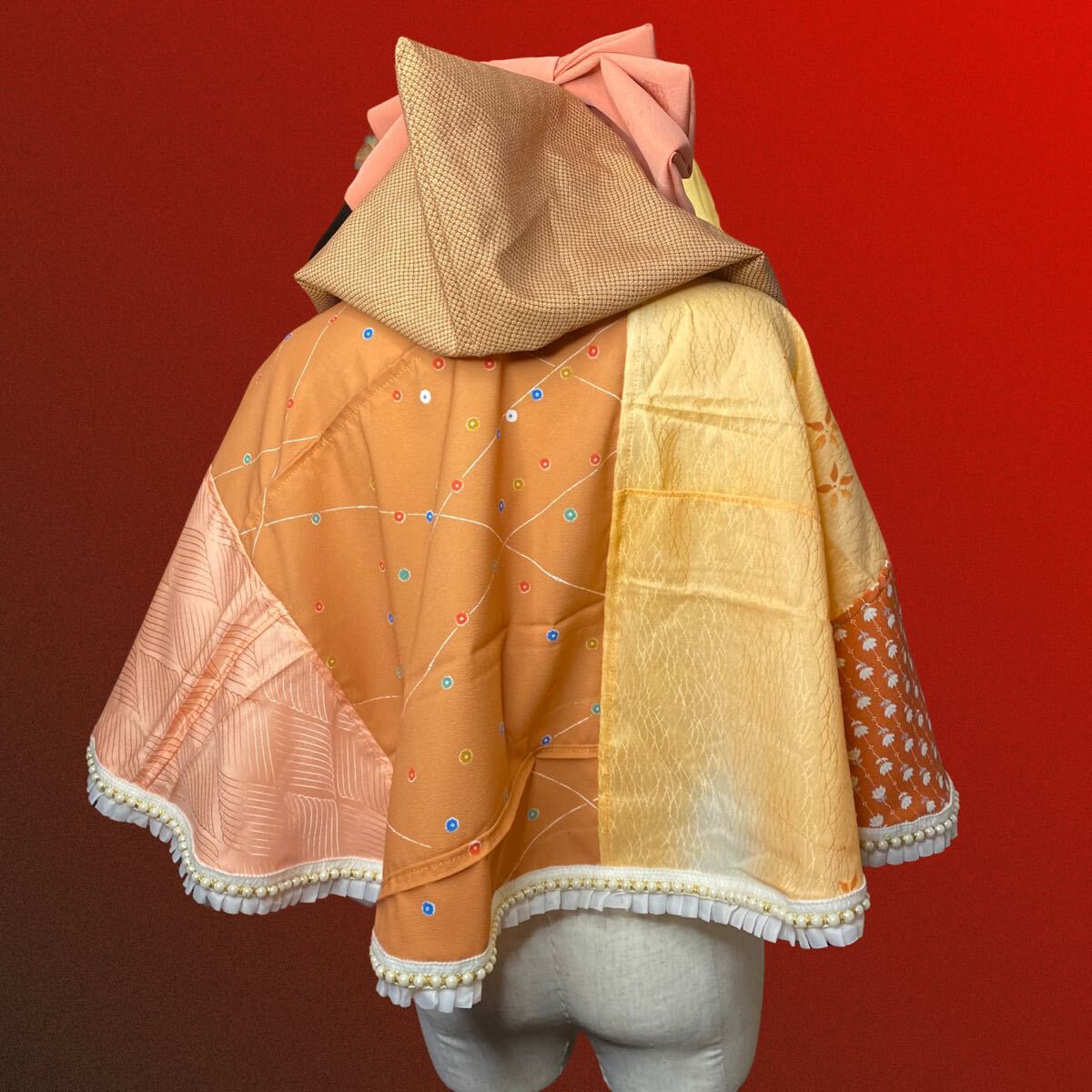 【リメイク着物ポンチョケープ 和装コート フード付き パールフリル 洗える 化繊素材 ハンドメイド 和洋折衷デザイン PK-7】