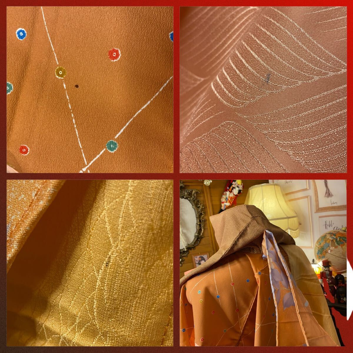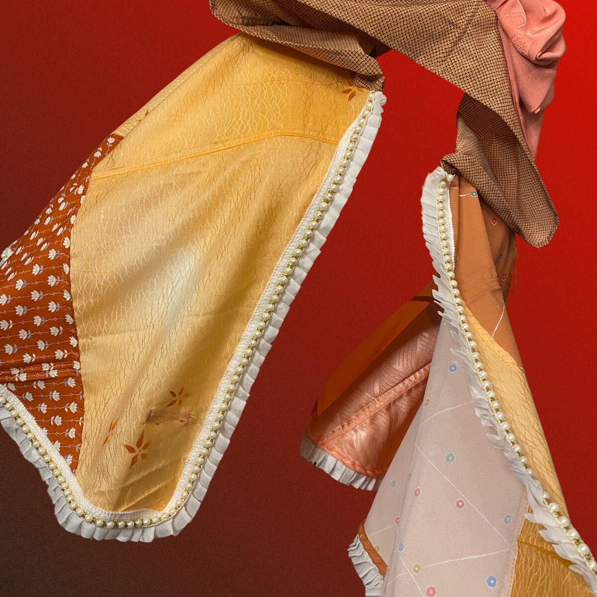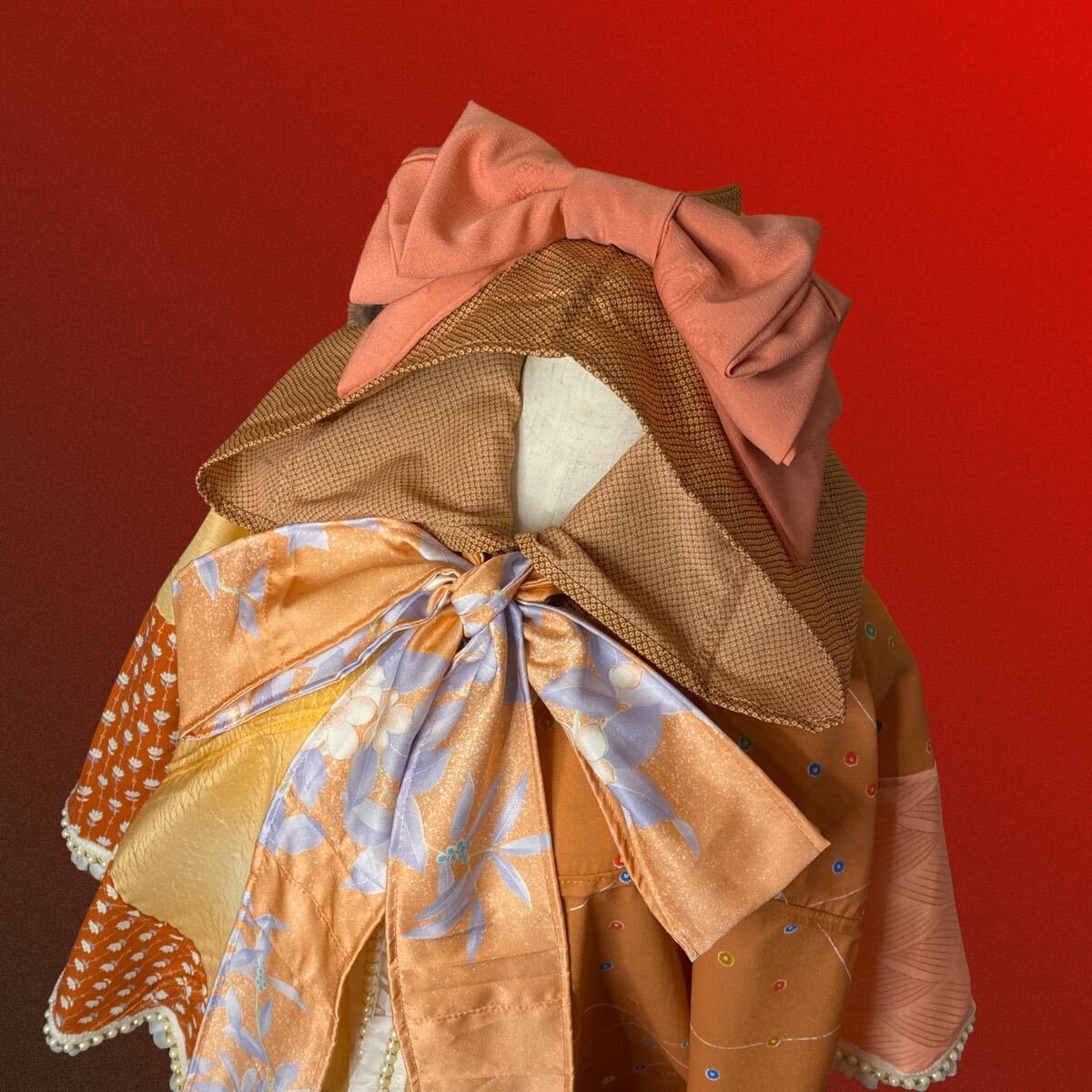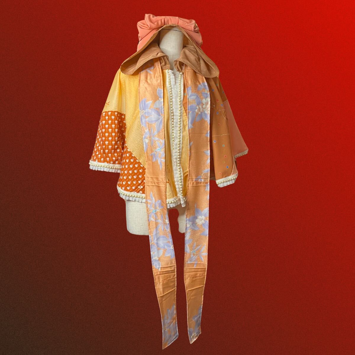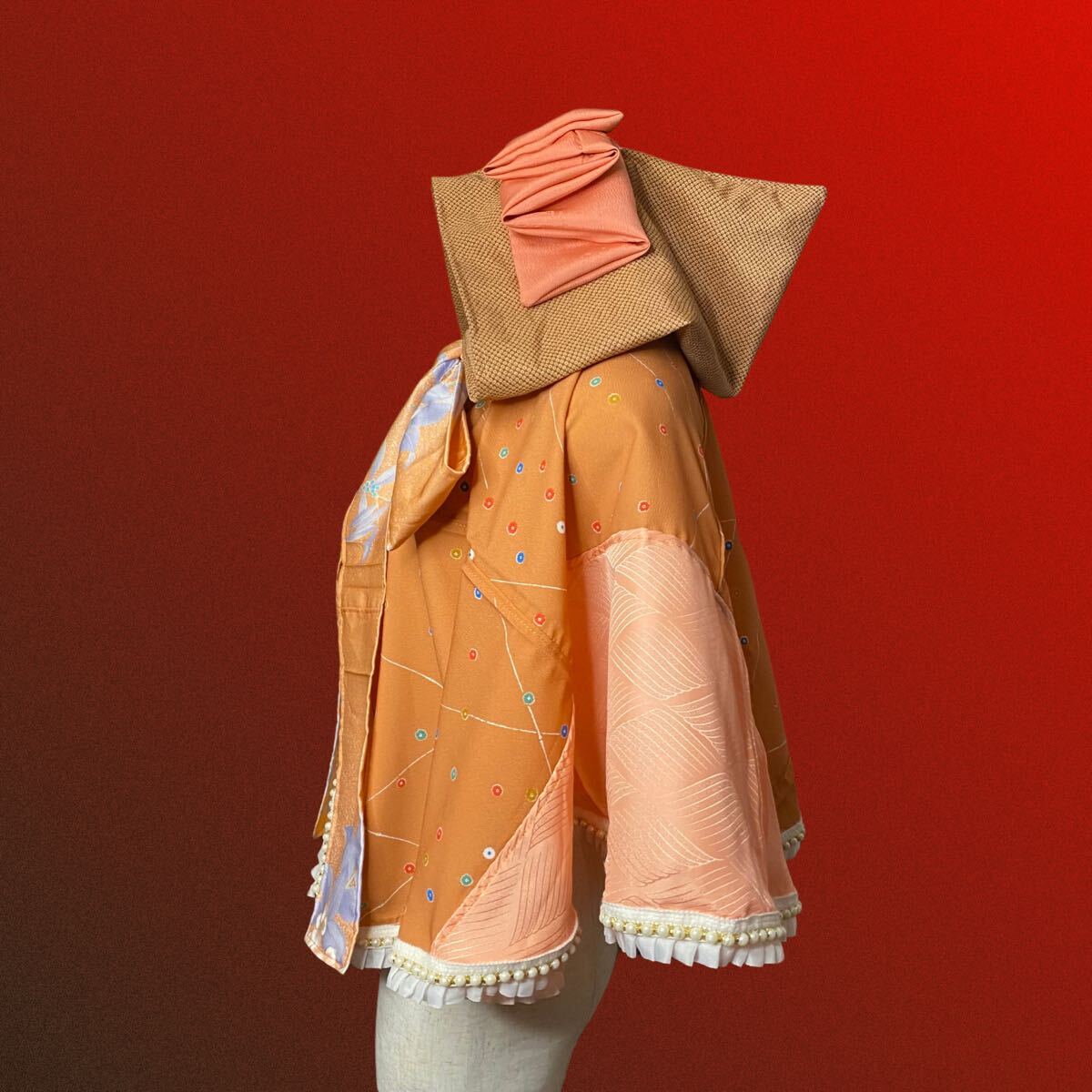 【リメイク着物ポンチョケープ 和装コート フード付き パールフリル 洗える 化繊素材 ハンドメイド 和洋折衷デザイン PK-7】