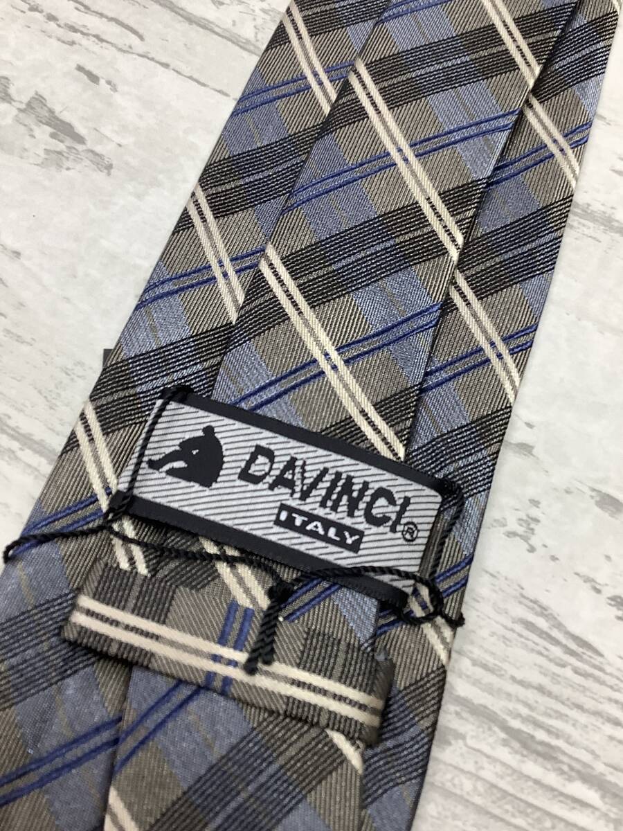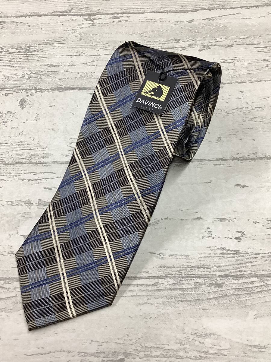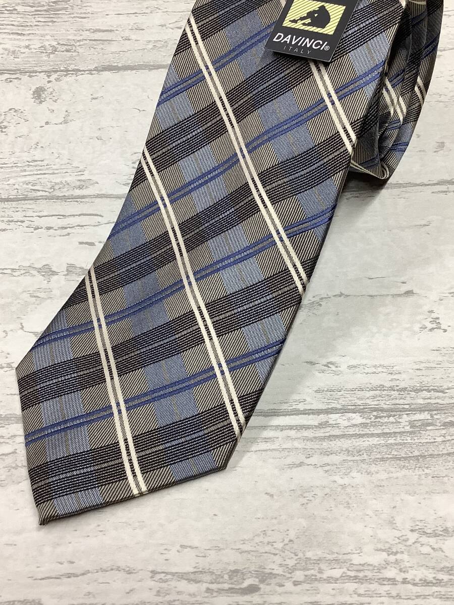 新品未使用 DAVINCI ダヴィンチ ベージュベース ブルーと白ライン  シルク100%チェックネクタイ お洒落柄 お買い得