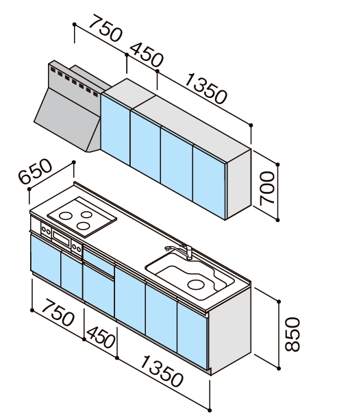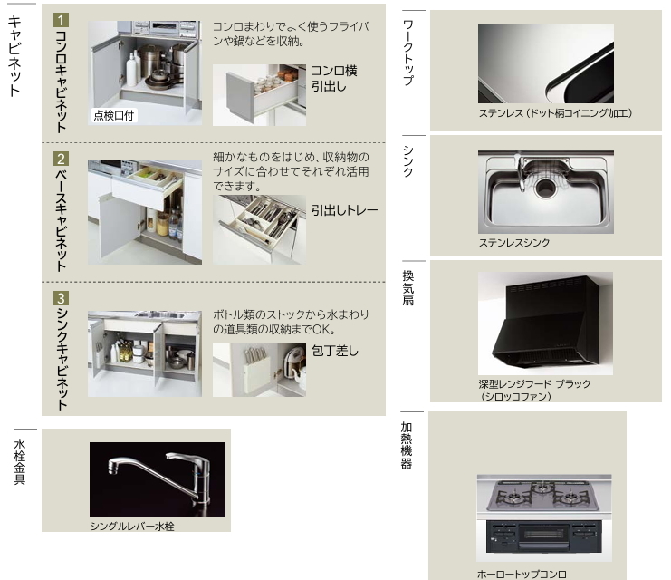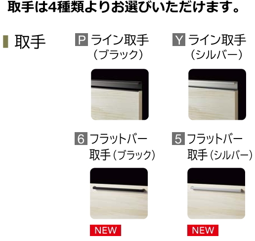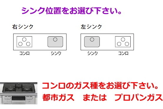 扉カラー、取手、シンク位置、ガス種をお選び下さい。