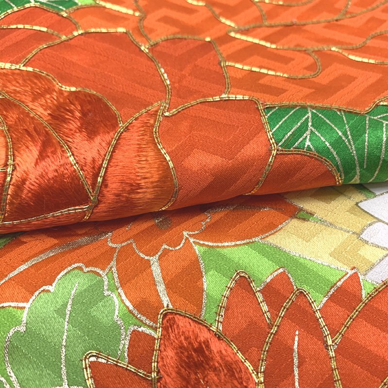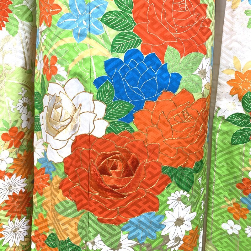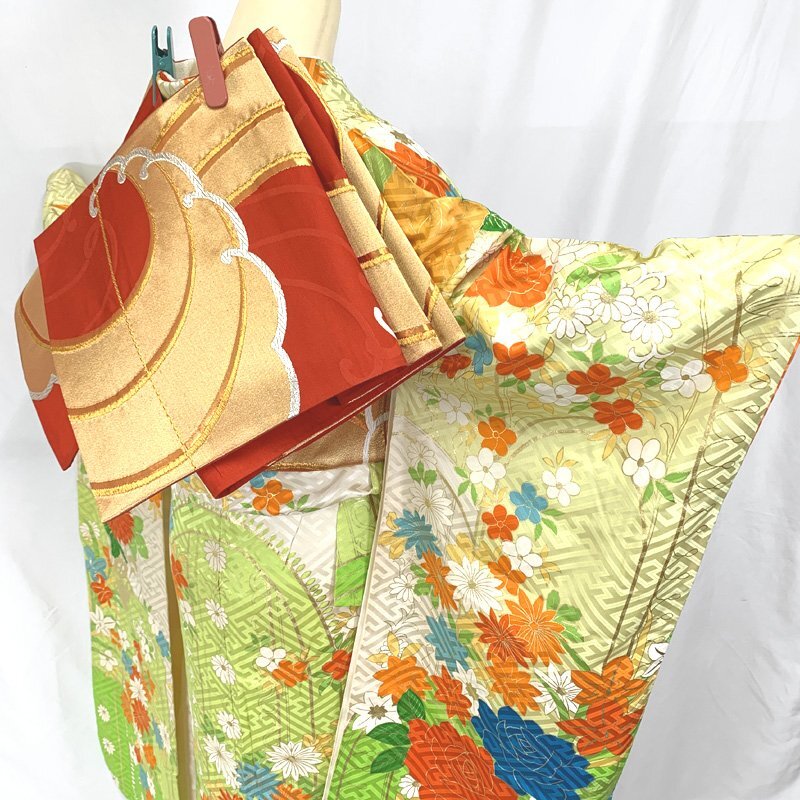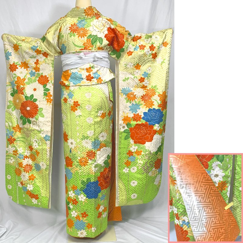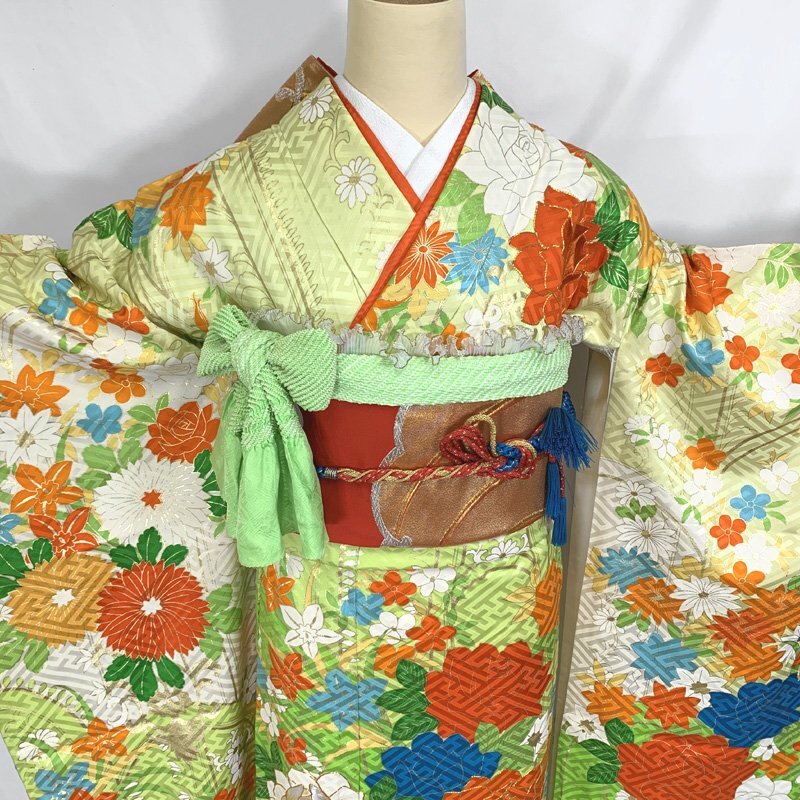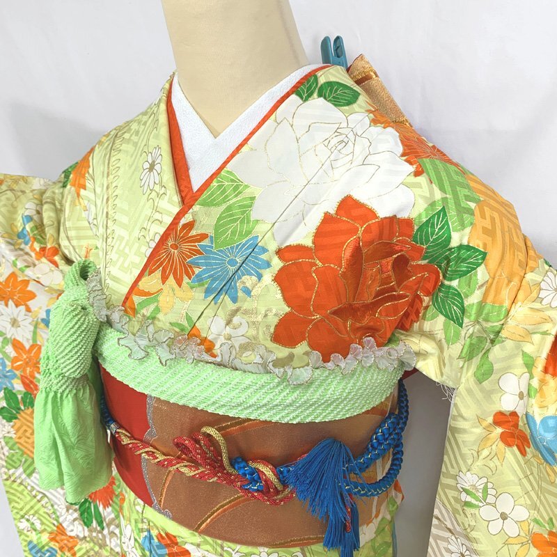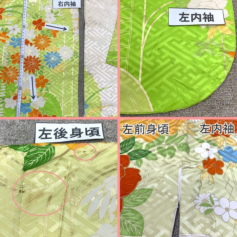 〇金駒刺繍 地紋 振袖&袋帯 刺繍 金彩 十三参り 成人式〇状態良好 紗綾形の地紋が浮かび上がる黄緑色の地に、薔薇(牡丹でしょうか?)や菊などの花が染め出された振袖です。一部ポイント刺繍や金駒刺繍が施されています。こちらの商品は振袖、袋帯です。お小物類(重ね衿、帯締め、帯揚げ)は+4000円、帯揚げに挟んでいる白レースは私物です。 小柄な大人の方の成人式、背の高いお子様の十三参りにもおすすめです。お子様がご着用される際は肩上げのお直しをお願いいたします。 (振袖)右内袖、左内袖、左後身頃にシミがございますが、遠目にはわかりません。画像以外にもいくつか薄いシミがございますが、どれも遠目にはわかりませんのでどうかご了承ください。左袖と身頃の縫込みに糸のほつれがございます。 (帯)締め跡はございますが、目立つようなシミ・ダメージもなく美品です。 【素材】正絹 【色】黄緑 *モニターによって色味は実際と異なる場合がございます。 【サイズ】