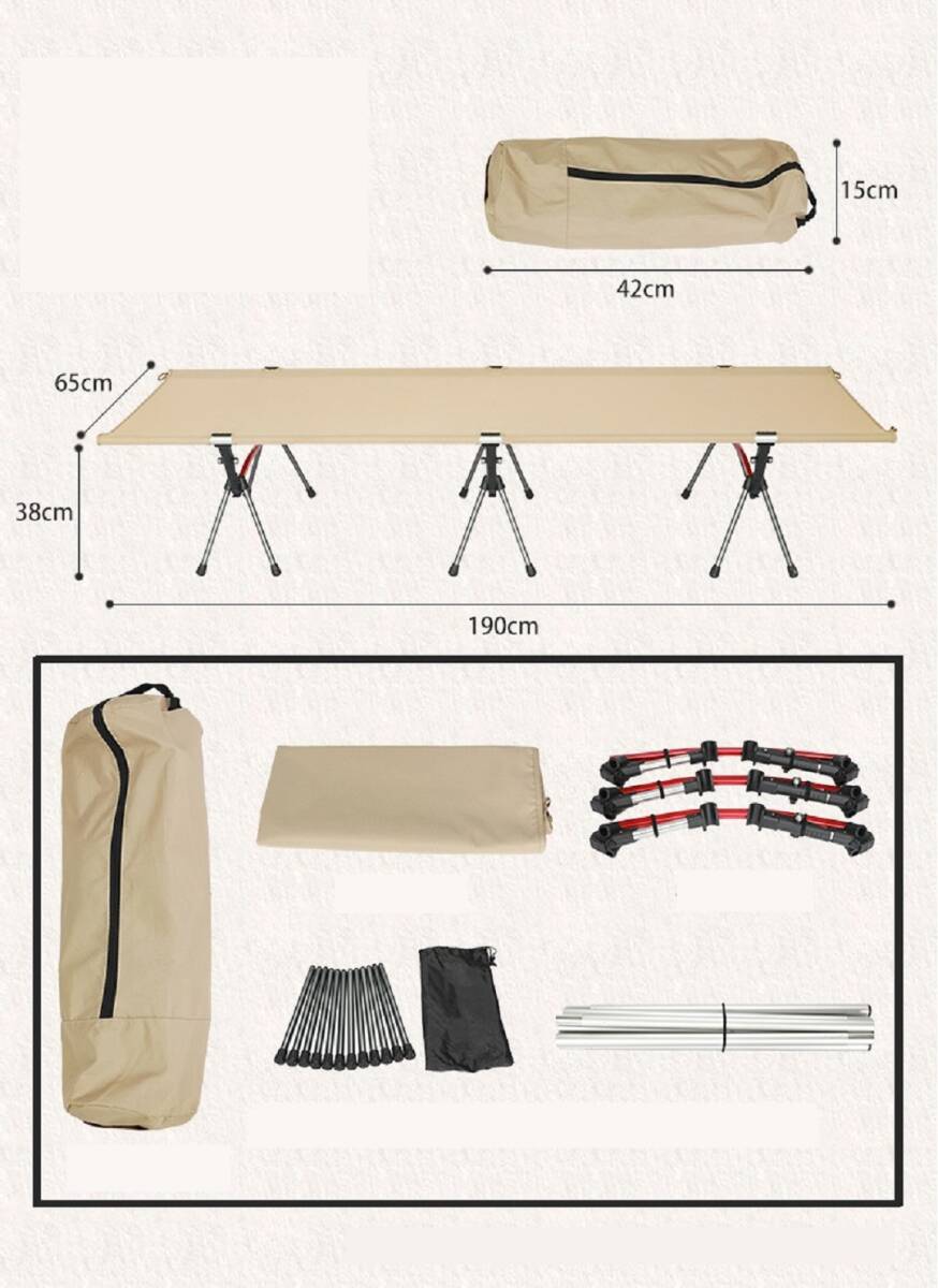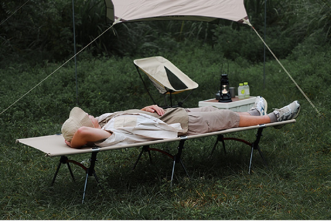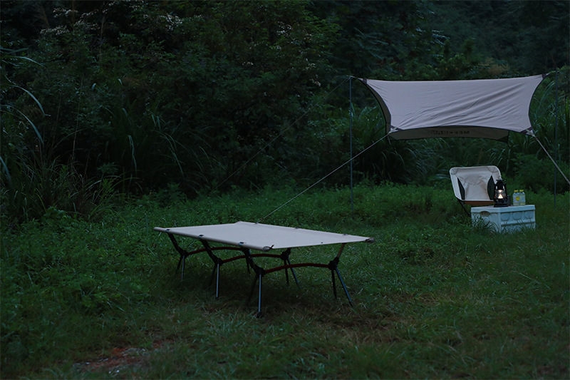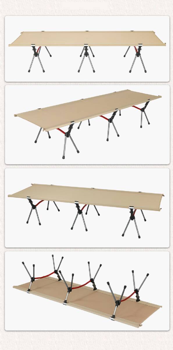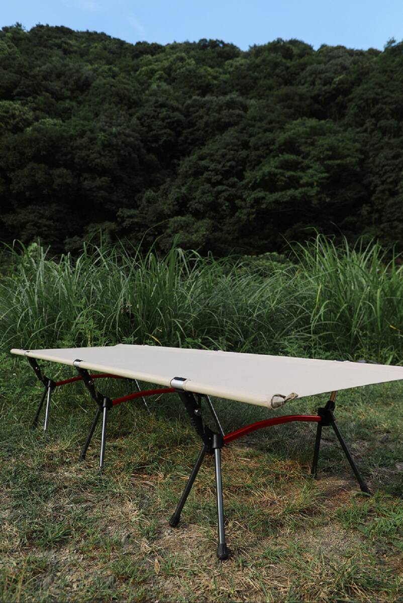 地面から距離をとることでどんな場所でも 凸凹を感じることなくいつでも快適に眠ることが可能になりマットで眠るのとはまた違うコットスタイルをお楽しみいただけます。
