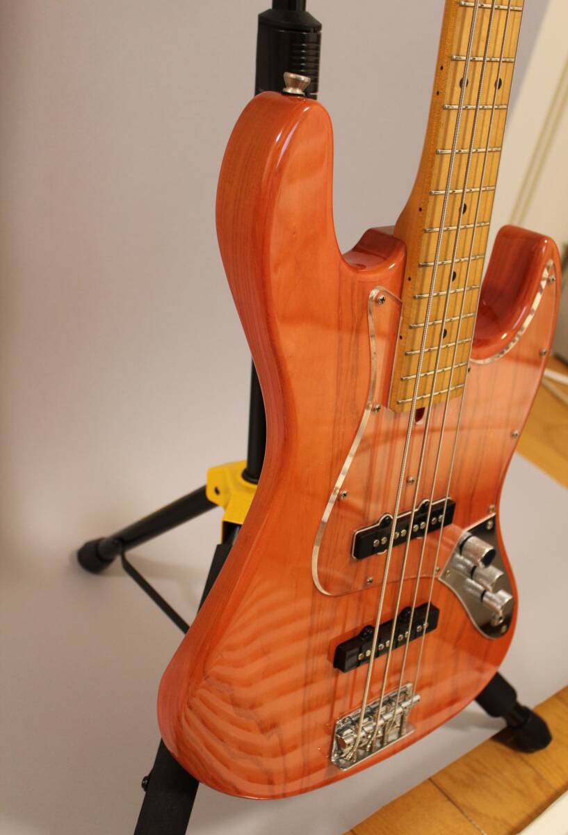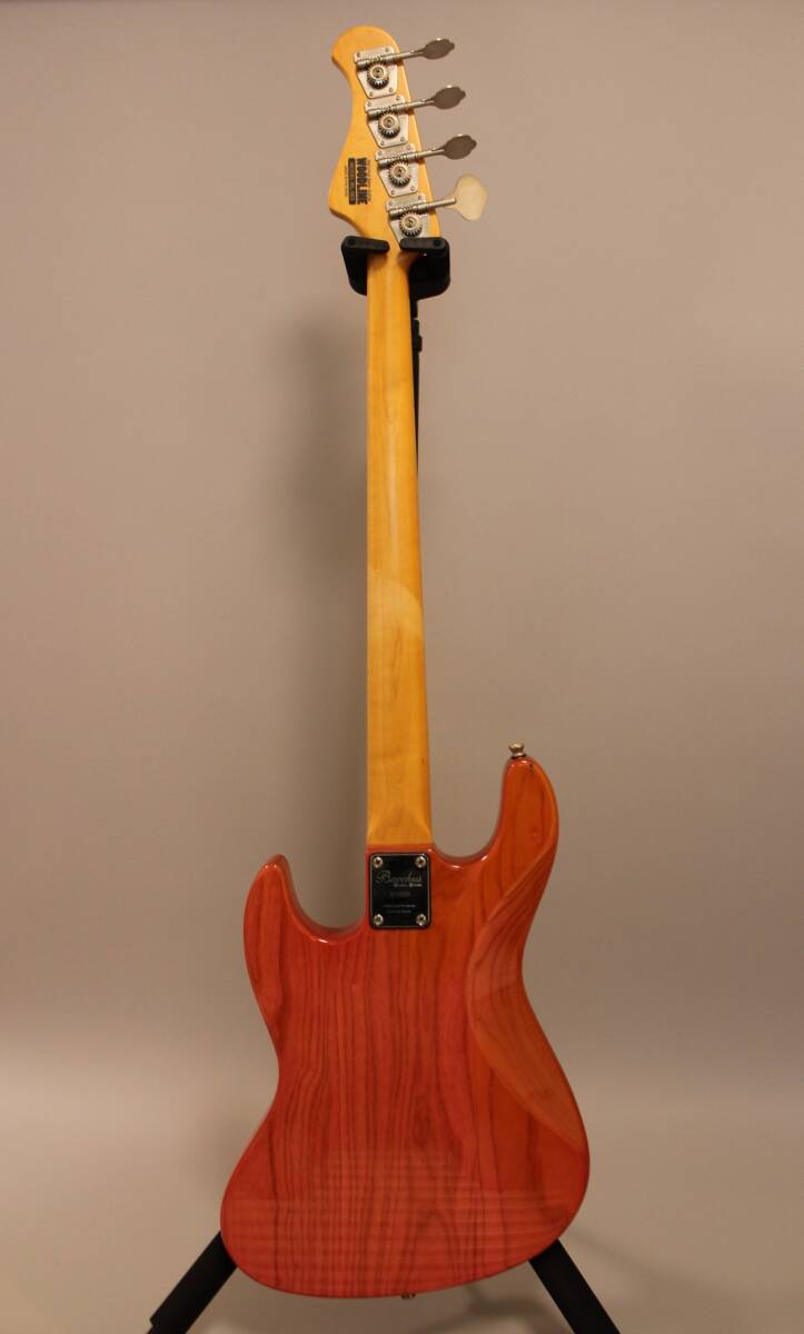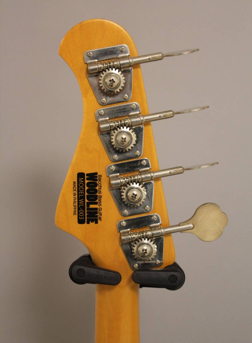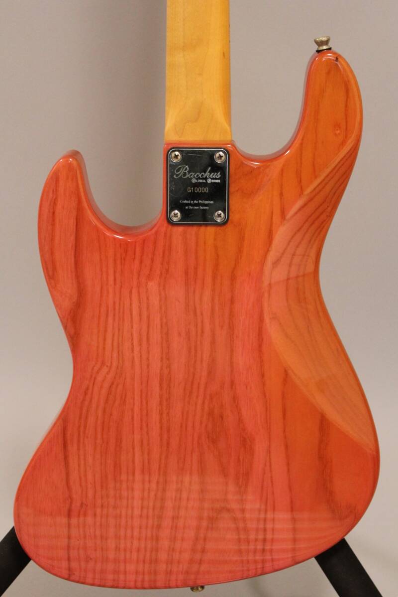| グローバルシリーズのWL-003モデルはバッカス フィリピンファクトリーで 製作されており、ハンドメイドシリーズやクラフトシリーズが製作されている国内工房と 同じ治具や設備を用意し、国産モデルと同等の作業工程を経て1本1本丁寧にハンドメイド 製作されています。 また、国内工房でマスタービルダーを務め、長いキャリアの中で培った経験と知識を持つ 髙江洲氏がフィリピンファクトリーの工場長を務めており、直接技術指導を行う事で、抑えられた製作コスト内で最大限のパフォーマンスを実現しています。 WL-003ハンドメイドシリーズの人気機種 WOODLINE 直系の姉妹機種となり、 アッシュ材をボディに使用し抜けが良くワイドレンジでクリアなサウンドが特徴です。上位モデルと同様にターボスイッチを搭載する事で、ナチュラルなパッシブトーンから、パンチのある図太いトーンまでサウンドメイクの幅を広げています。また、アッシュ材の特有のはっきりとした木目を活かしたウレタン塗装のシースルーカラーです。 [ボディ] ボディにはアッシュ材を使用しており、低音域~高音域までバランスよく鳴つつも、クリアな高音域とレスポンスが良く抜けの良いサウンドを出力します。 また、WL-003モデルはWOODLINEと同じディンキーボディサイズでネックとのバランスも良く、取り回し易くなっています。 塗装はシースルー系のウレタングロス塗装、アッシュ材の木目を活かしたカラーリングに仕上げられています。また、木目を損なわないよう、クリアピックガードを搭載。シンプルなジャズベーススタイルながらも一層の存在感を際立たせています。 [ネック] メイプル指板モデルは高音域側の抜けが良い明るいサウンドが特徴です。ネック裏はウレタンのサテンフィニッシュで仕上げられており、サラサラとした手触りでスムーズなフィンガリングを実現します。 ネックを調整するトラスロッドも上位モデルと同様の工程で仕込まれており、 効きがよく、しっかりとした剛性とメンテナンス性に優れています。 フレットワイヤーも国産の物が使用されており、演奏性、耐久性にも優れています。 [ピックアップ] 材の鳴りを損なわない程よい出力でアルニコマグネットを使用したピックアップを搭載。各音域のバランスも良く、プレイヤーのピッキングニュアンス、ダイナミクス、材の特性を活かしたナチュラルなサウンドです。 ・リアピックアップ 直流抵抗値(k):7.95 トーンチャート: (Low):10 (Mid-Low):11 (Mid-High):11 (High):10 ・フロントピックアップ 直流抵抗値(k):7.60 トーンチャート: (Low):10 (Mid-Low):11 (Mid-High):11 (High):10 [コントロール] 通常のジャズベースと同じ2ボリューム、1トーン仕様ですが、ターボスイッチが搭載されており、トーンノブをプルアップする事でターボ回路がONになり、ややボリュームが上がり、 より中低音域が強調された力強いサウンドを出力します。 ターボ回路の仕組みにつきましては、通常、「パラレル(並列)回路」で配線されているフロント/リアピックアップをターボONで「シリーズ(直列)回路」に切り替える事で独立していたフロント/リアピックアップが一体となり、流れる信号の量が増す事でパワフルなサウンドへと変化します。 ※ターボ回路ONの時はリアピックアップのボリュームがスルーされ、フロントピックアップノブがマスターボリュームとなった1ボリューム、1トーンの仕様となります。 ―商品説明― 【ブランド】 :Bacchus 【品番】 :WL-003(21フレット仕様)モデル 【定価】 :99,000円 【ボディ】 :アッシュ 3P 【ネック】 :メイプル 【指板】 :メイプル 【PU】 :WSC/JBA 【重量】 :4.755kg ―商品状態― 【状態】 :B+ 中古良品 【ロッド残】:締める方向・緩める方向調整可能で±60°まで動作確認済みです。 【ネック】 :演奏上の問題はありません。おおむねストレート 【ナット】:問題なし 【フレット】:約8-9割程度問題なし。 【ボディ】 :キズ、弾きキズがあり 【電装系】 :音出し確認済み。特に問題なし。 【弦高(12F計測)】:4弦2.5mm1弦 2.0m セットアップ済み(クリーニング済、ロッド調整・オクターブ調整・弦高調整・PU高さ調整)弦は45-105 12Fの弦高は4弦2.5mm1弦 2.0mで調整してあり、ネックはおおむねストレートです。フレット山は演奏に問題ない高さがあり、トラスロッドは締める方向・緩める方向調整可能で±60°まで動作確認済みです。すぐに即戦力としてお使いいただけます。 | |||