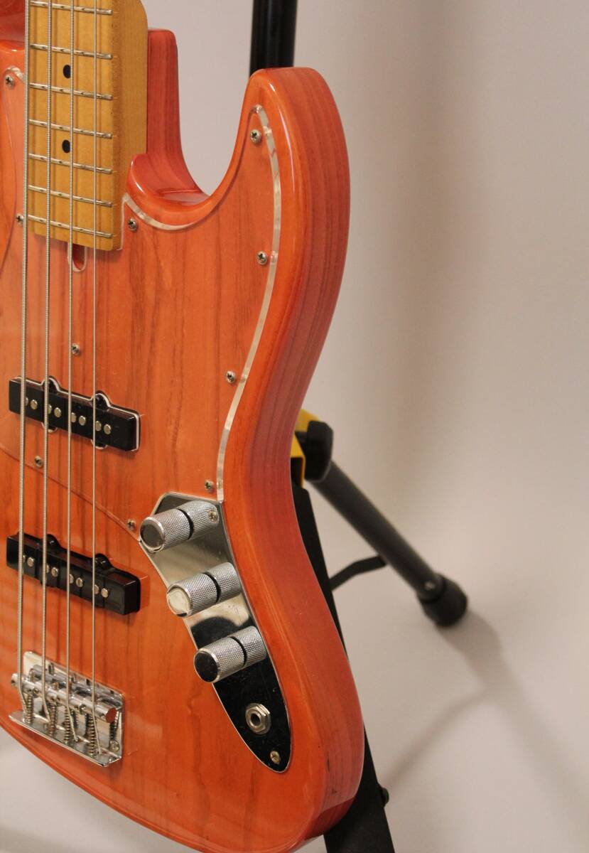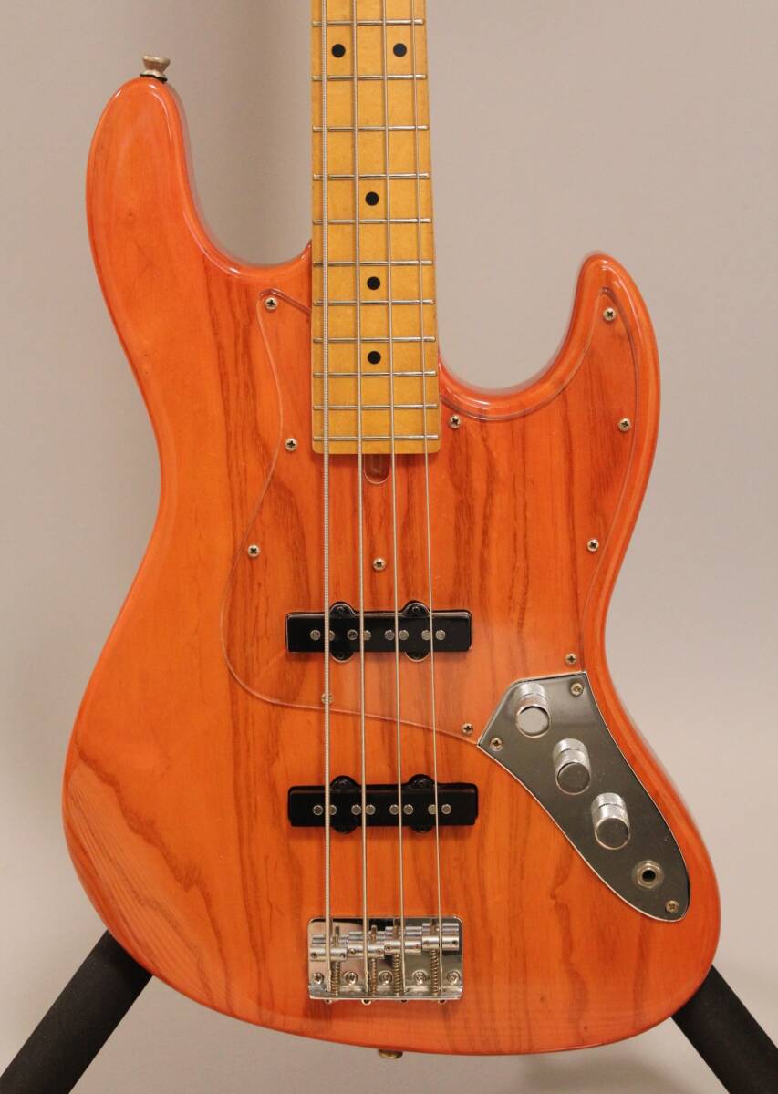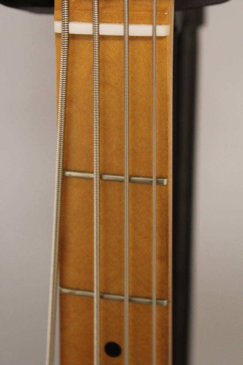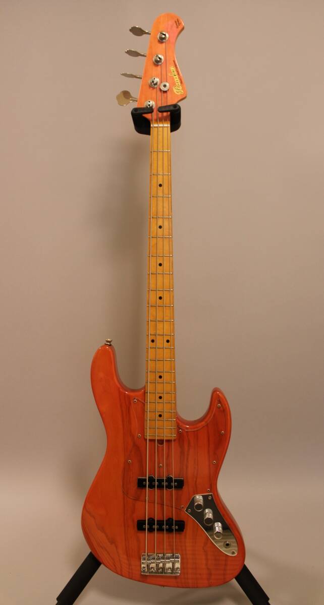 | グローバルシリーズのWL-003モデルはバッカス フィリピンファクトリーで 製作されており、ハンドメイドシリーズやクラフトシリーズが製作されている国内工房と 同じ治具や設備を用意し、国産モデルと同等の作業工程を経て1本1本丁寧にハンドメイド 製作されています。 また、国内工房でマスタービルダーを務め、長いキャリアの中で培った経験と知識を持つ 髙江洲氏がフィリピンファクトリーの工場長を務めており、直接技術指導を行う事で、抑えられた製作コスト内で最大限のパフォーマンスを実現しています。 WL-003ハンドメイドシリーズの人気機種 WOODLINE 直系の姉妹機種となり、 アッシュ材をボディに使用し抜けが良くワイドレンジでクリアなサウンドが特徴です。上位モデルと同様にターボスイッチを搭載する事で、ナチュラルなパッシブトーンから、パンチのある図太いトーンまでサウンドメイクの幅を広げています。また、アッシュ材の特有のはっきりとした木目を活かしたウレタン塗装のシースルーカラーです。 [ボディ] ボディにはアッシュ材を使用しており、低音域~高音域までバランスよく鳴つつも、クリアな高音域とレスポンスが良く抜けの良いサウンドを出力します。 また、WL-003モデルはWOODLINEと同じディンキーボディサイズでネックとのバランスも良く、取り回し易くなっています。 塗装はシースルー系のウレタングロス塗装、アッシュ材の木目を活かしたカラーリングに仕上げられています。また、木目を損なわないよう、クリアピックガードを搭載。シンプルなジャズベーススタイルながらも一層の存在感を際立たせています。 [ネック] メイプル指板モデルは高音域側の抜けが良い明るいサウンドが特徴です。ネック裏はウレタンのサテンフィニッシュで仕上げられており、サラサラとした手触りでスムーズなフィンガリングを実現します。 ネックを調整するトラスロッドも上位モデルと同様の工程で仕込まれており、 効きがよく、しっかりとした剛性とメンテナンス性に優れています。 フレットワイヤーも国産の物が使用されており、演奏性、耐久性にも優れています。 [ピックアップ] 材の鳴りを損なわない程よい出力でアルニコマグネットを使用したピックアップを搭載。各音域のバランスも良く、プレイヤーのピッキングニュアンス、ダイナミクス、材の特性を活かしたナチュラルなサウンドです。 ・リアピックアップ 直流抵抗値(k):7.95 トーンチャート: (Low):10 (Mid-Low):11 (Mid-High):11 (High):10 ・フロントピックアップ 直流抵抗値(k):7.60 トーンチャート: (Low):10 (Mid-Low):11 (Mid-High):11 (High):10 [コントロール] 通常のジャズベースと同じ2ボリューム、1トーン仕様ですが、ターボスイッチが搭載されており、トーンノブをプルアップする事でターボ回路がONになり、ややボリュームが上がり、 より中低音域が強調された力強いサウンドを出力します。 ターボ回路の仕組みにつきましては、通常、「パラレル(並列)回路」で配線されているフロント/リアピックアップをターボONで「シリーズ(直列)回路」に切り替える事で独立していたフロント/リアピックアップが一体となり、流れる信号の量が増す事でパワフルなサウンドへと変化します。 ※ターボ回路ONの時はリアピックアップのボリュームがスルーされ、フロントピックアップノブがマスターボリュームとなった1ボリューム、1トーンの仕様となります。 ―商品説明― 【ブランド】 :Bacchus 【品番】 :WL-003(21フレット仕様)モデル 【定価】 :99,000円 【ボディ】 :アッシュ 3P 【ネック】 :メイプル 【指板】 :メイプル 【PU】 :WSC/JBA 【重量】 :4.755kg ―商品状態― 【状態】 :B+ 中古良品 【ロッド残】:締める方向・緩める方向調整可能で±60°まで動作確認済みです。 【ネック】 :演奏上の問題はありません。おおむねストレート 【ナット】:問題なし 【フレット】:約8-9割程度問題なし。 【ボディ】 :キズ、弾きキズがあり 【電装系】 :音出し確認済み。特に問題なし。 【弦高(12F計測)】:4弦2.5mm1弦 2.0m セットアップ済み(クリーニング済、ロッド調整・オクターブ調整・弦高調整・PU高さ調整)弦は45-105 12Fの弦高は4弦2.5mm1弦 2.0mで調整してあり、ネックはおおむねストレートです。フレット山は演奏に問題ない高さがあり、トラスロッドは締める方向・緩める方向調整可能で±60°まで動作確認済みです。すぐに即戦力としてお使いいただけます。 | |||