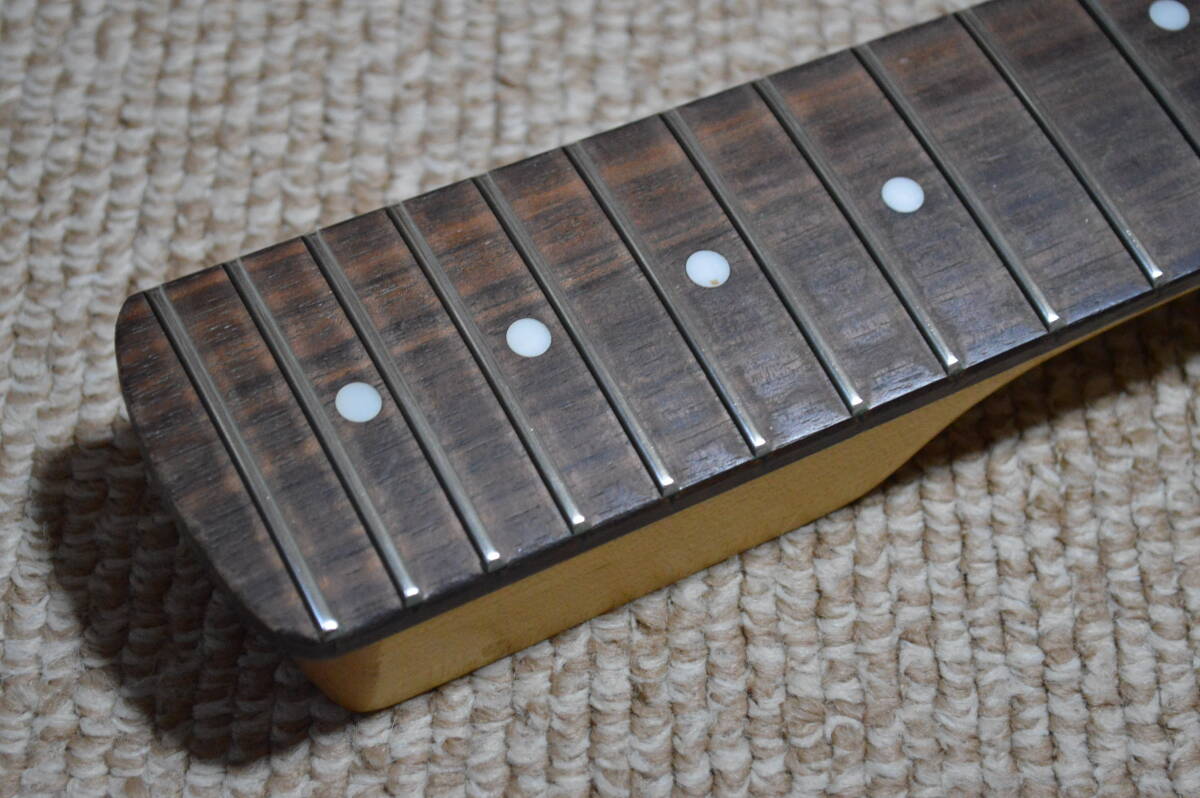 ネックはレギュラースケール、22フレット、ジョイント部分の最大幅は約57.1ミリです。