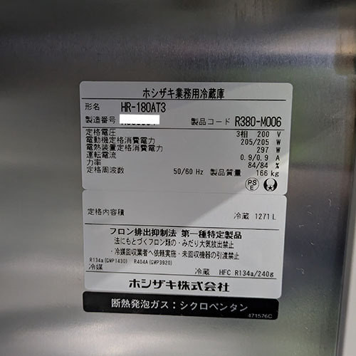 【業界最長1年保証】縦型冷蔵庫 ホシザキ HR-180AT3 業務用 中古/送料別途見積