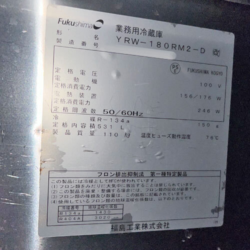 冷蔵コールドテーブル フクシマガリレイ(福島工業) YRW-180RM2-D 業務用 中古/送料別途見積