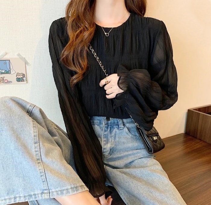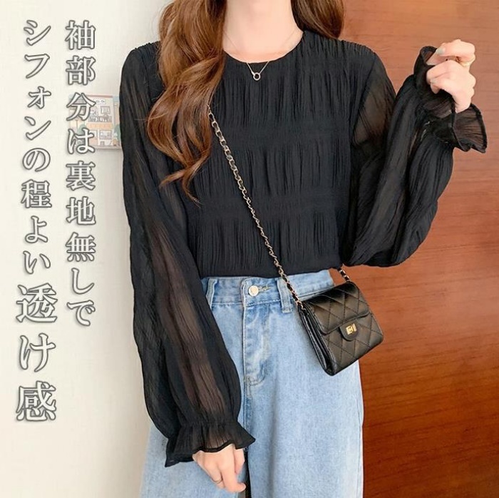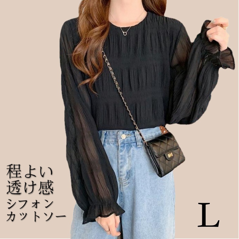 送料無料★新品 程よい透け感 長袖 シフォン カットソー シャーリング フリル トップス レディース★ブラック/L | ||||