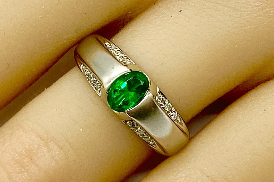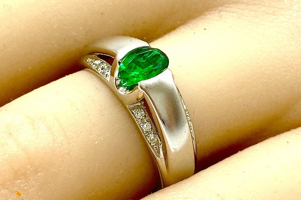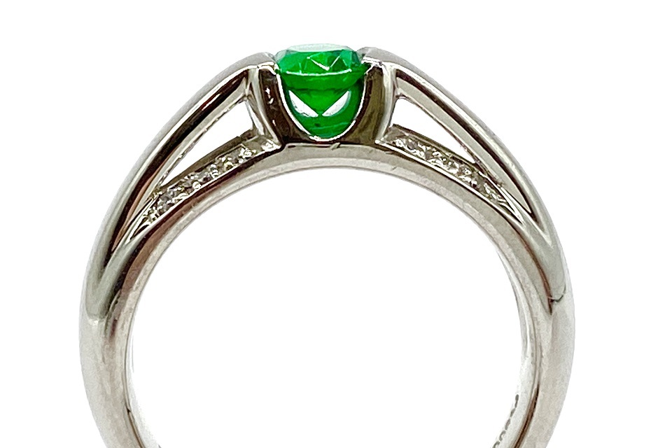 | 解説 | 煌めき感が素晴らしいヴィヴィッドグリーンのエメラルド。その美しさをフェイスアップのみならず、側面から楽しめるよう設計されたデザインです。小粒でも大いなる魅力のスケールに、心がたっぷりと満たされます。 |