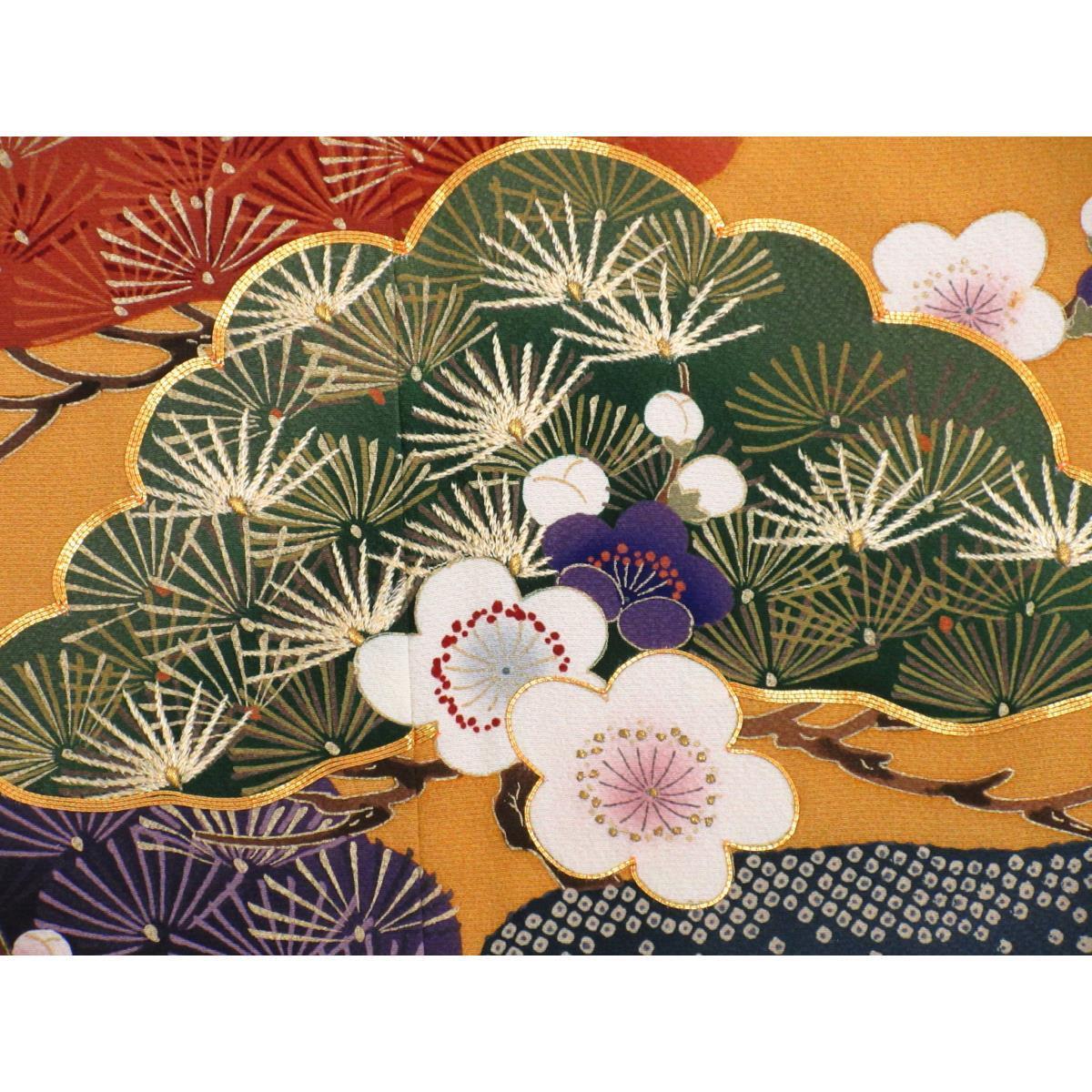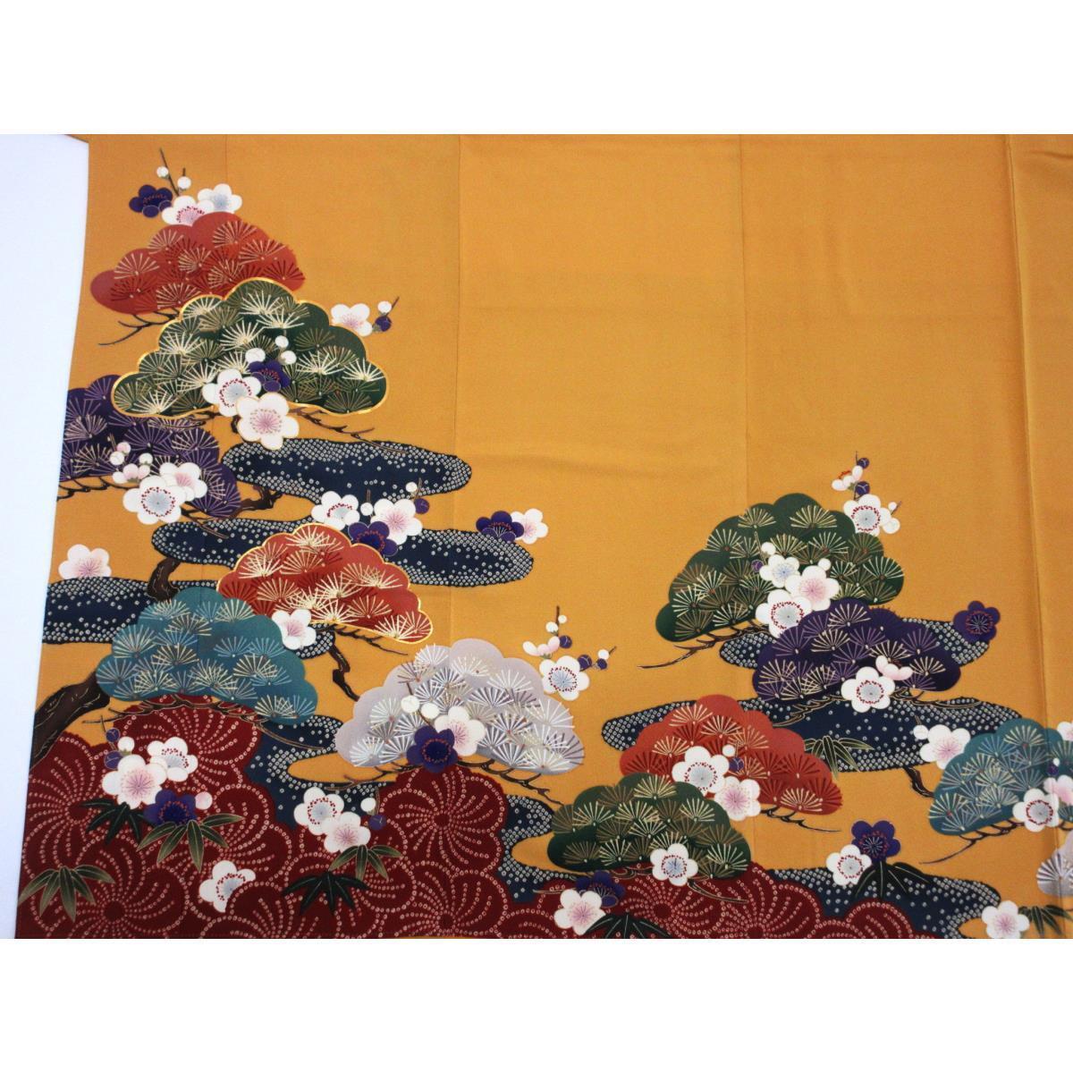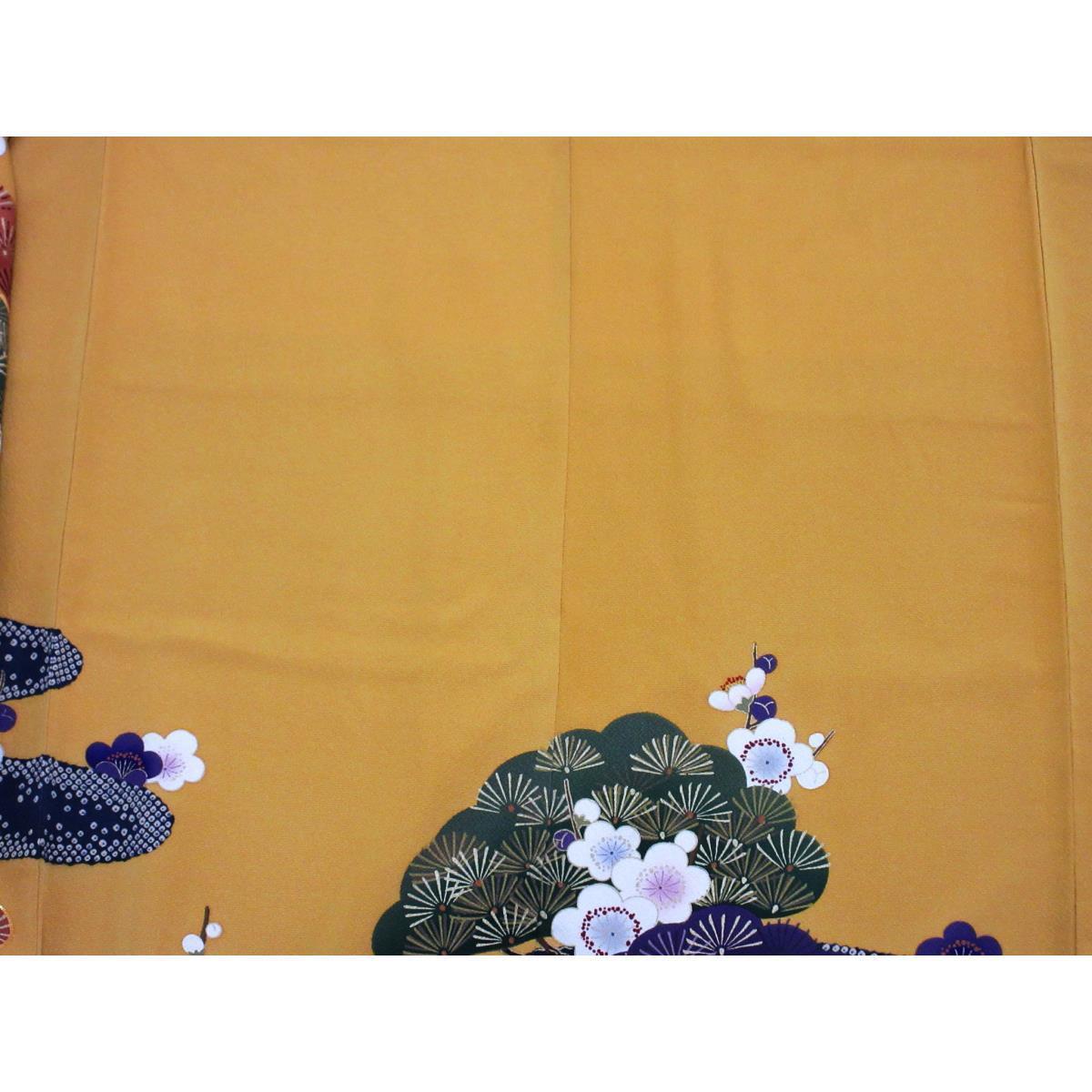 やや暗めの黄橙色の地に、松竹梅を友禅金彩加工であらわした花井幸子の振袖です。どこかレトロな雰囲気を感じさせるような、吉祥文様がシックに映えるお品です。適応シーン:結婚式・披露宴、パーティー、お出かけ、成人式