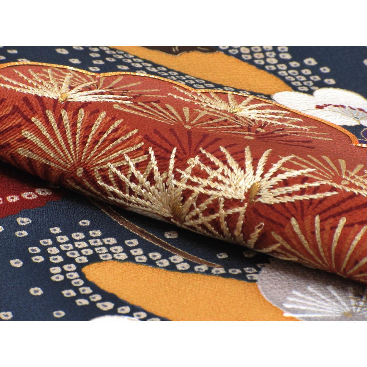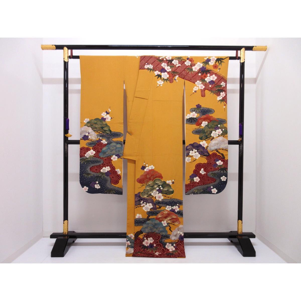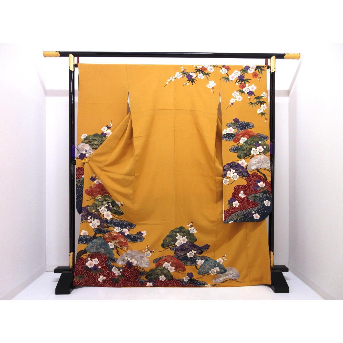 やや暗めの黄橙色の地に、松竹梅を友禅金彩加工であらわした花井幸子の振袖です。どこかレトロな雰囲気を感じさせるような、吉祥文様がシックに映えるお品です。適応シーン:結婚式・披露宴、パーティー、お出かけ、成人式