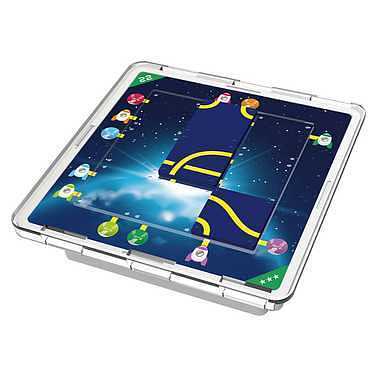 問題カードに描かれたロケットと惑星、それぞれ同じ色同士がつながるように空いている場所をパズルピースを埋めてルートを作りましょう。
