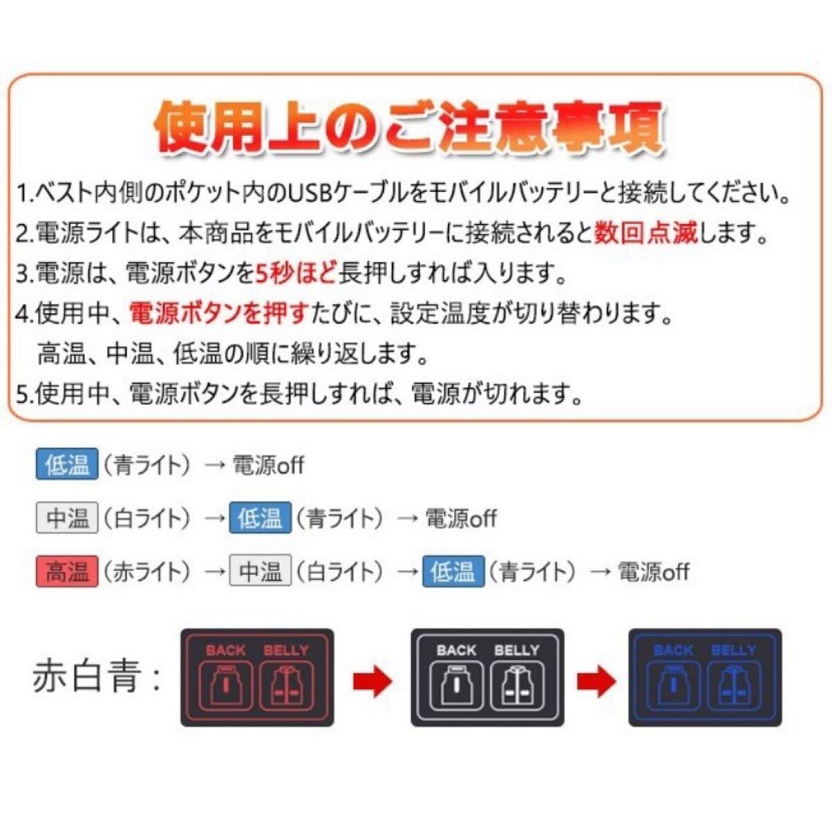 ● 腰部・背中・腹部・首がぽかぽかに!ワンボタンで「弱、中、強」の3段階での温度コントロールができる電熱ベストです。
