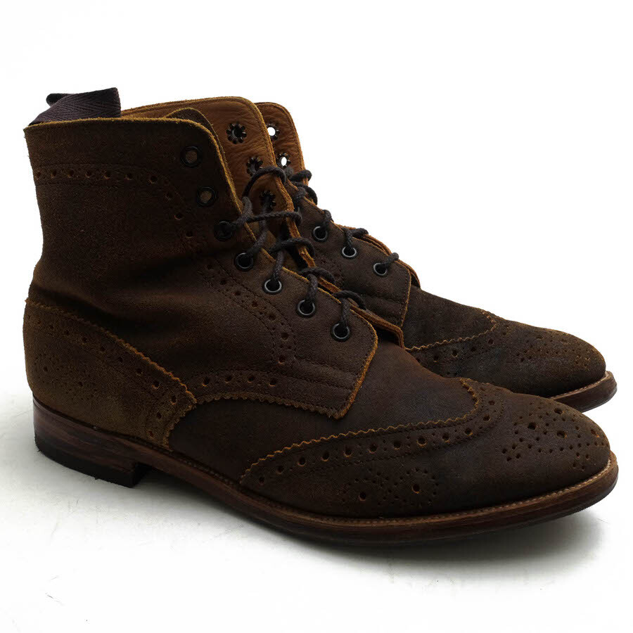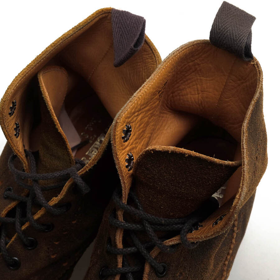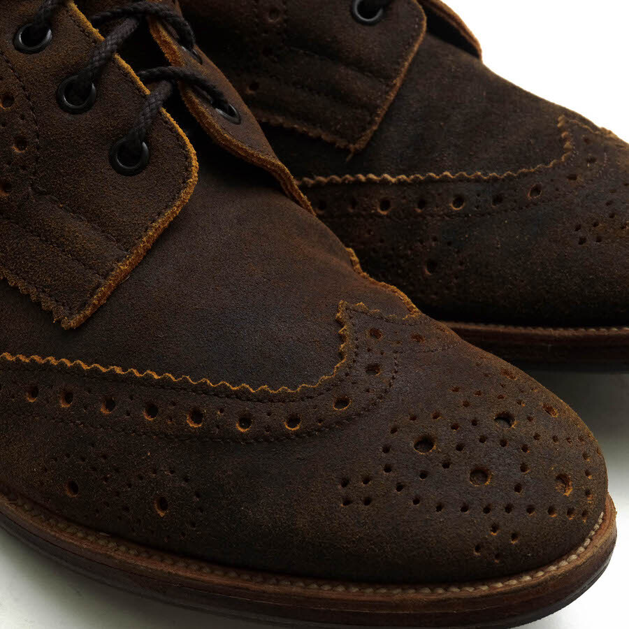 | トリッカーズを代表するプロダクトであるカントリーブーツ。ベンチメイドと呼ばれる一人の靴職人が一足を最初から最後まで担当する方法で作り上げられたこだわりの詰まった一足。ウィングチップの7アイレットブーツで、トゥ・キャップのメダリオンや、パーツごとに施されたブローギングがトラッドな印象。グッドイヤー・ウェルト製法で仕上られるダブル・ソールは、耐久性に富み、カントリー・ブーツだけに田舎道もガンガン歩けるぐらい頑丈。 |