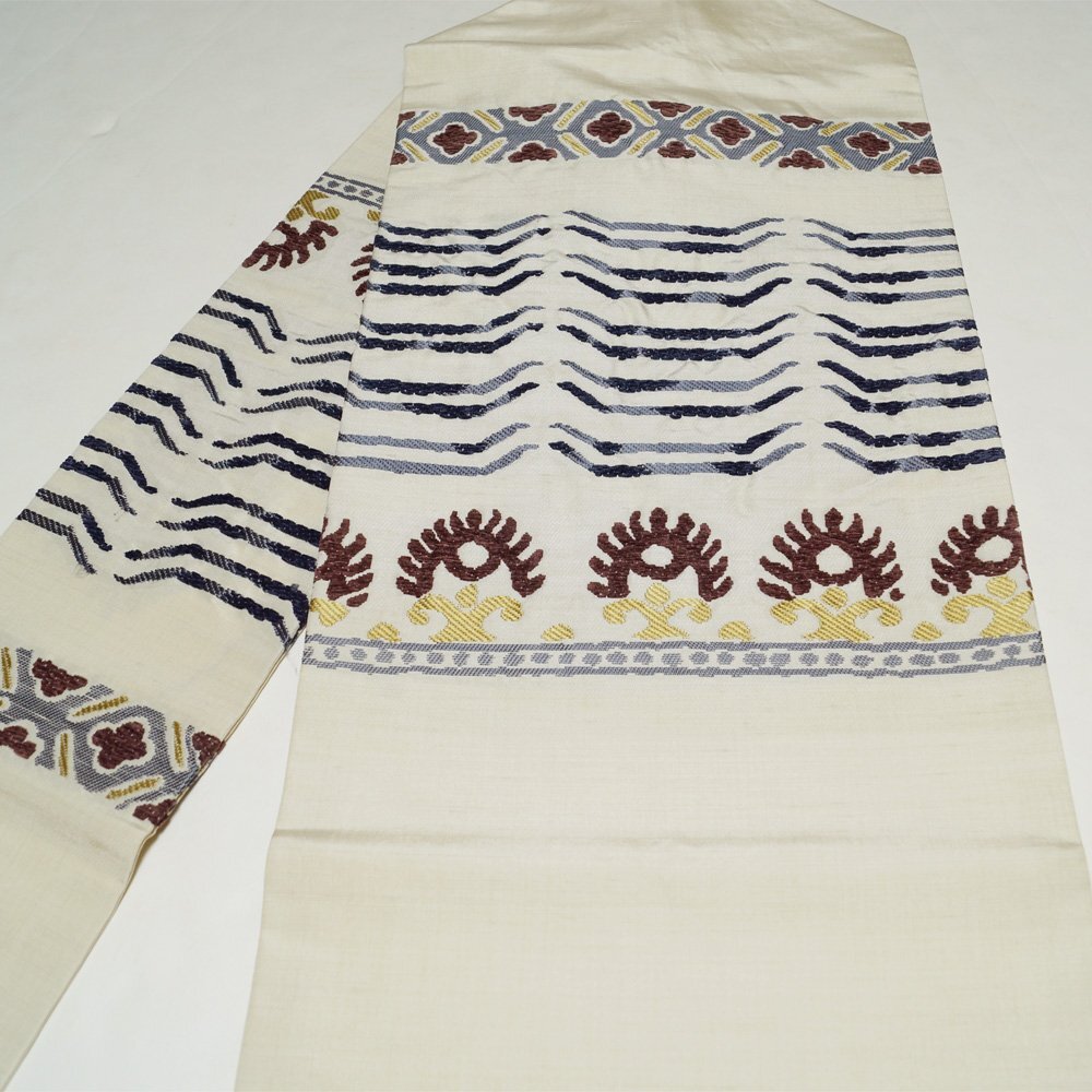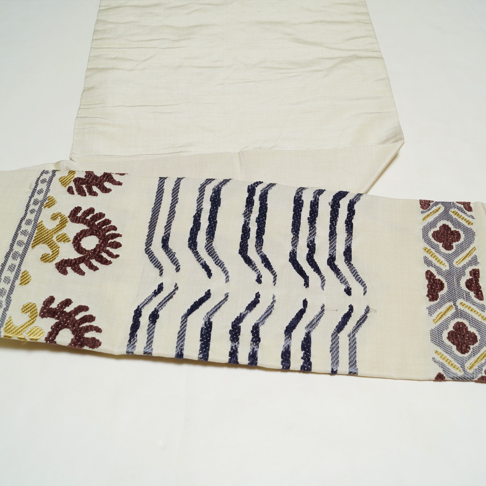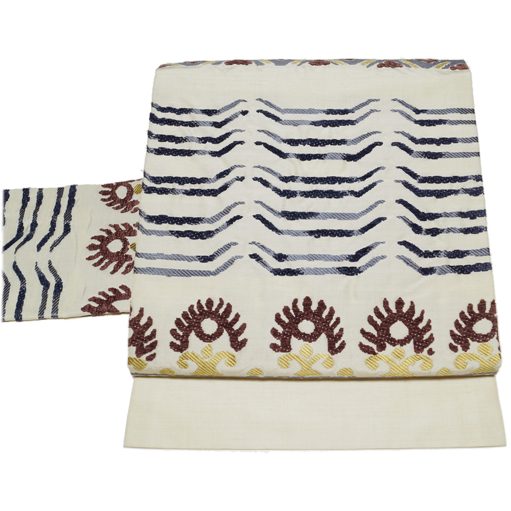 | 商品 説明 | 薄めの灰白色系の紬地に幾何学的な模様がモール織された西陣 川島織物製の名古屋帯です。川島織物の銘や軍配マークはありませんが、お太鼓上部の裏側中の縫い目端に三本線が織られておりますので、川島織物製で間違いは無いかと存じます。 持ち主様から買い取りさせていただきました際のお話にて、変わった模様をご希望されたようで、わざわざこのチベタン文様を特注で織ってもらったお品との事です。 |